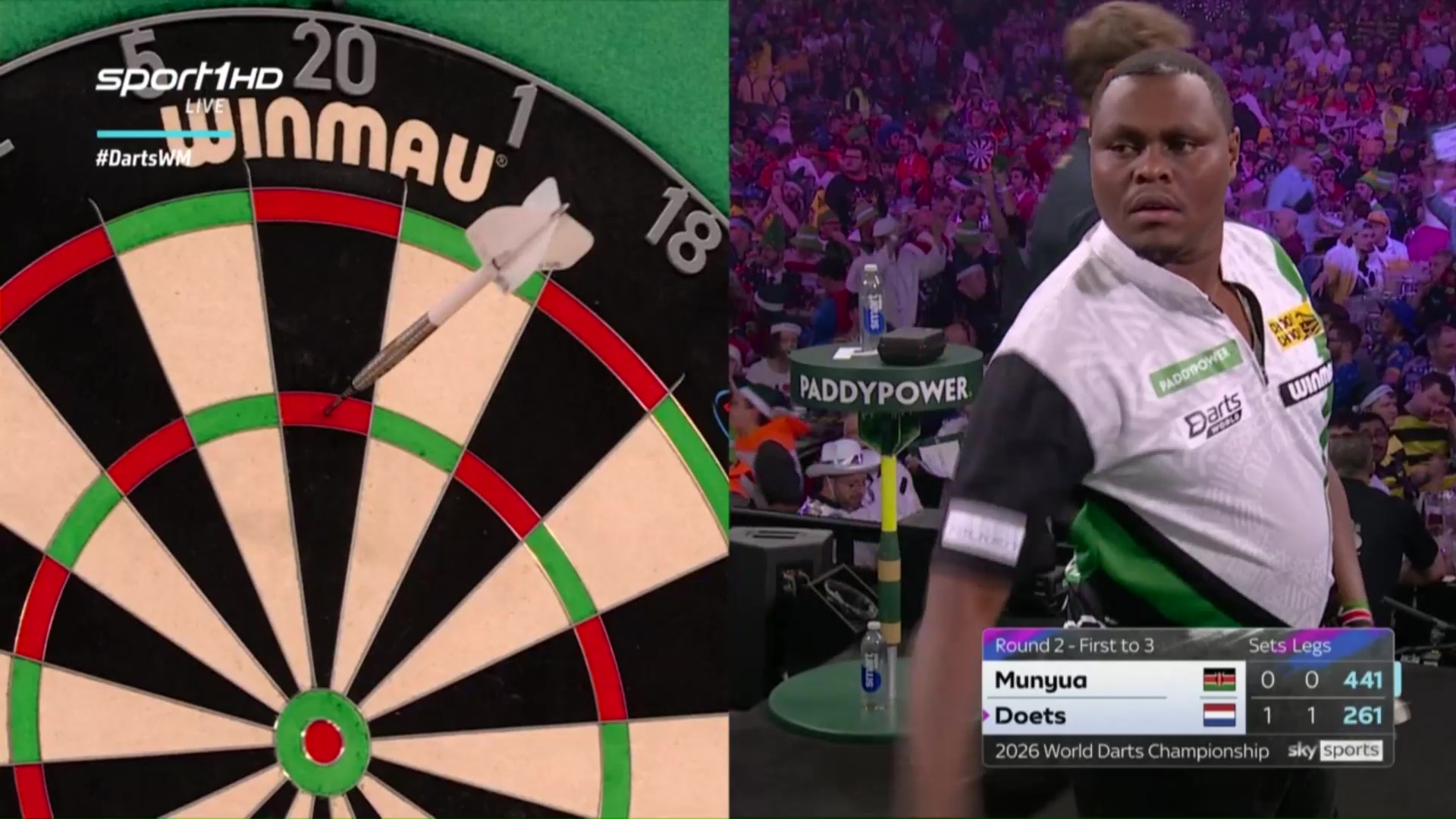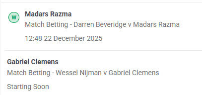 The 2025/26 Paddy Power World Darts Championship continues at London’s Alexandra Palace on Monday with the tournament's tenth double session of action.Day Twelve of the World Darts Championship sees 2023/24 World Champion Luke Humphries headlining the double session as he faces Singaporean veteran Paul Lim in the evening session. Former World Matchplay champion Nathan Aspinall takes on Leonard Gates in a repeat of their round two clash last year, and freshly-anointed Alexandra Palace icon David Munyua faces Kevin Doets.Coverage starts at 12:30pm UK time on Sky Sports Darts (SS F1) with the evening session at 7:00pm UK time on the same channel. All matches are the best of 5 sets (first to 3) with each set being the first to 3 legs.>Today’s matches (12:30pm start)Darren Beveridge v Madars Razma(31) Wessel Nijman v Gabriel ClemensDavid Munyua v Kevin Doets(7) James Wade v Ricky Evans>Tonight's matches (7:00pm start)(10) Gian Van Veen v Alan Soutar(15) Nathan Aspinall v Leonard Gates(2) Luke Humphries v Paul LimCharlie Manby v Adam Sevada>Day 11 rounduphttps://www.pdc.tv/news/2025/12/21/plaisier-knocks-out-price-littler-rolls-world-championship