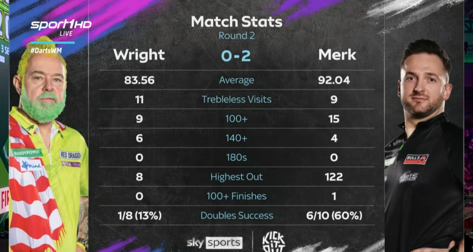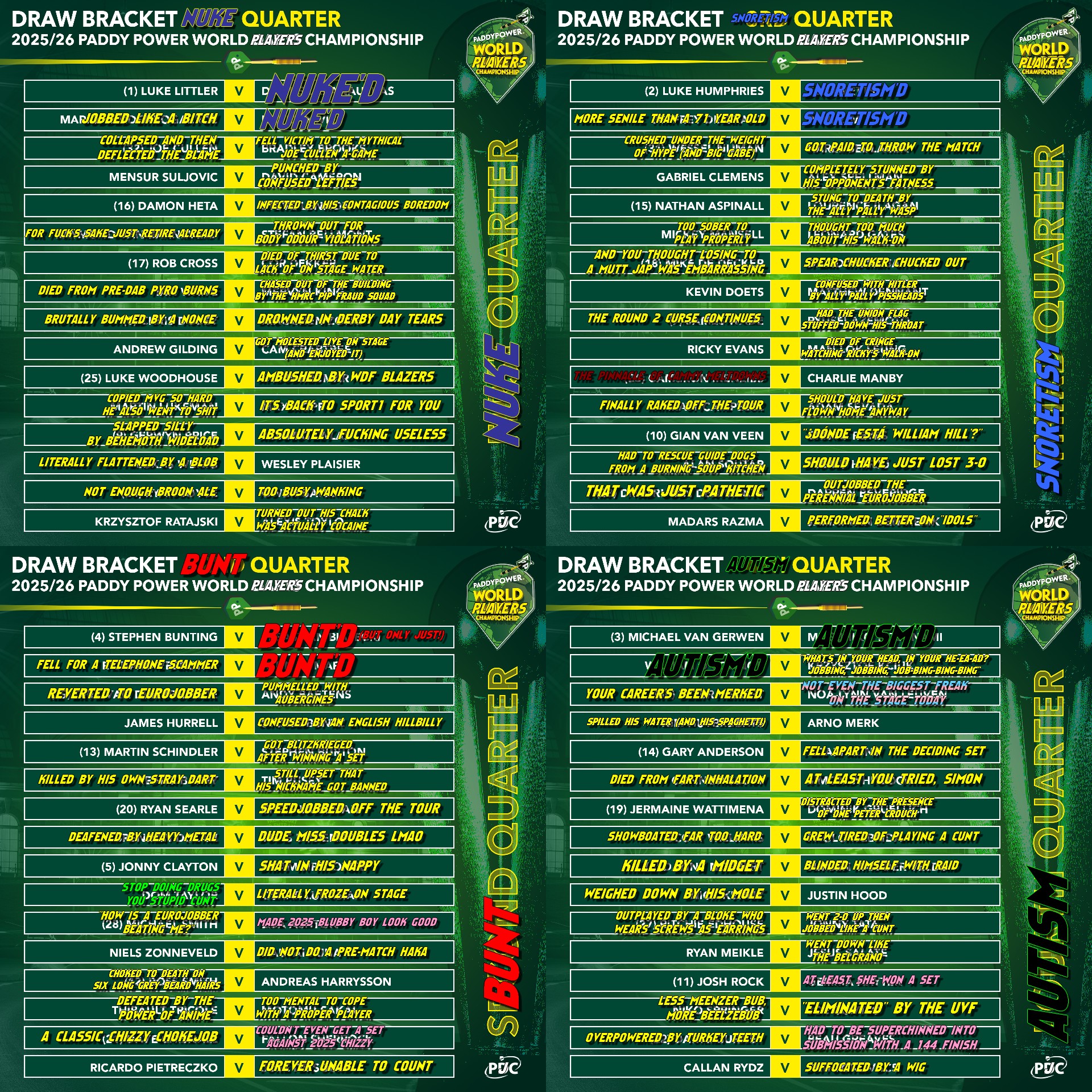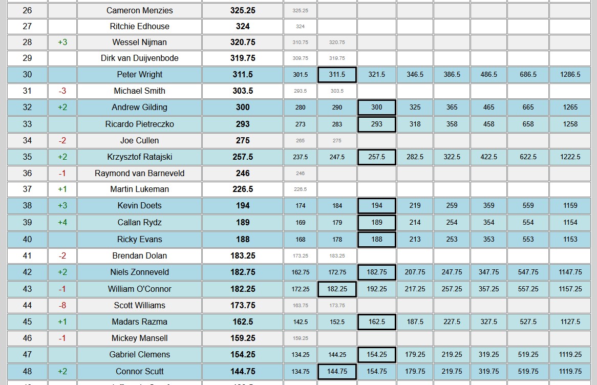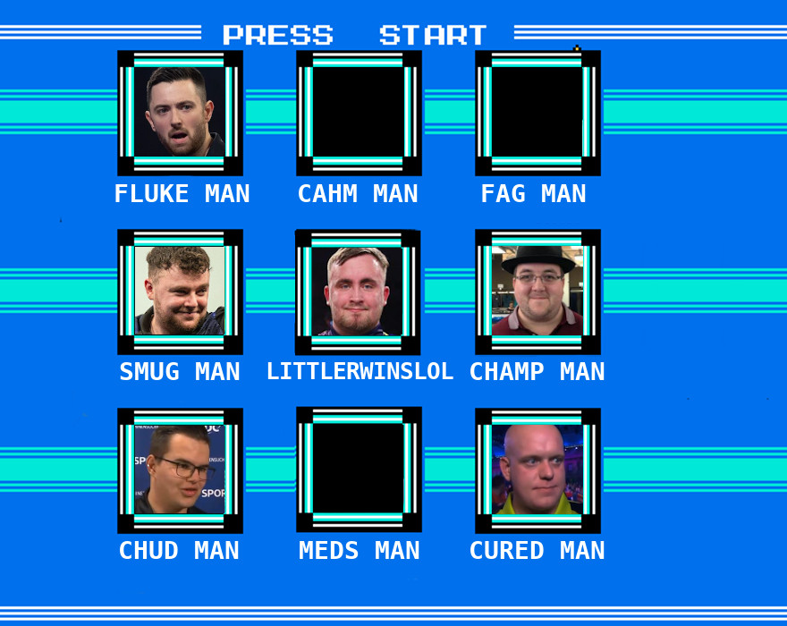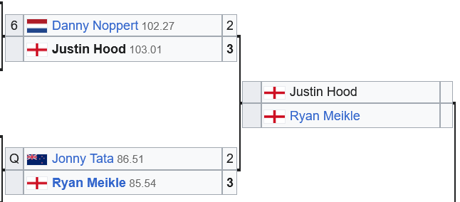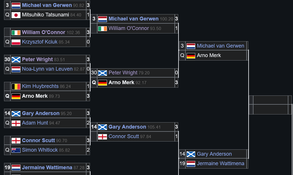 >Meikle>Wygz>Wattijobber>ClownKinda rough lineup for the afternoon session. Gurney vs Wygz and R. Unknown vs Shaggy could be good, though. Also I can see Clown going home here. Any 85+ average might do the trick, and Merk can do that.