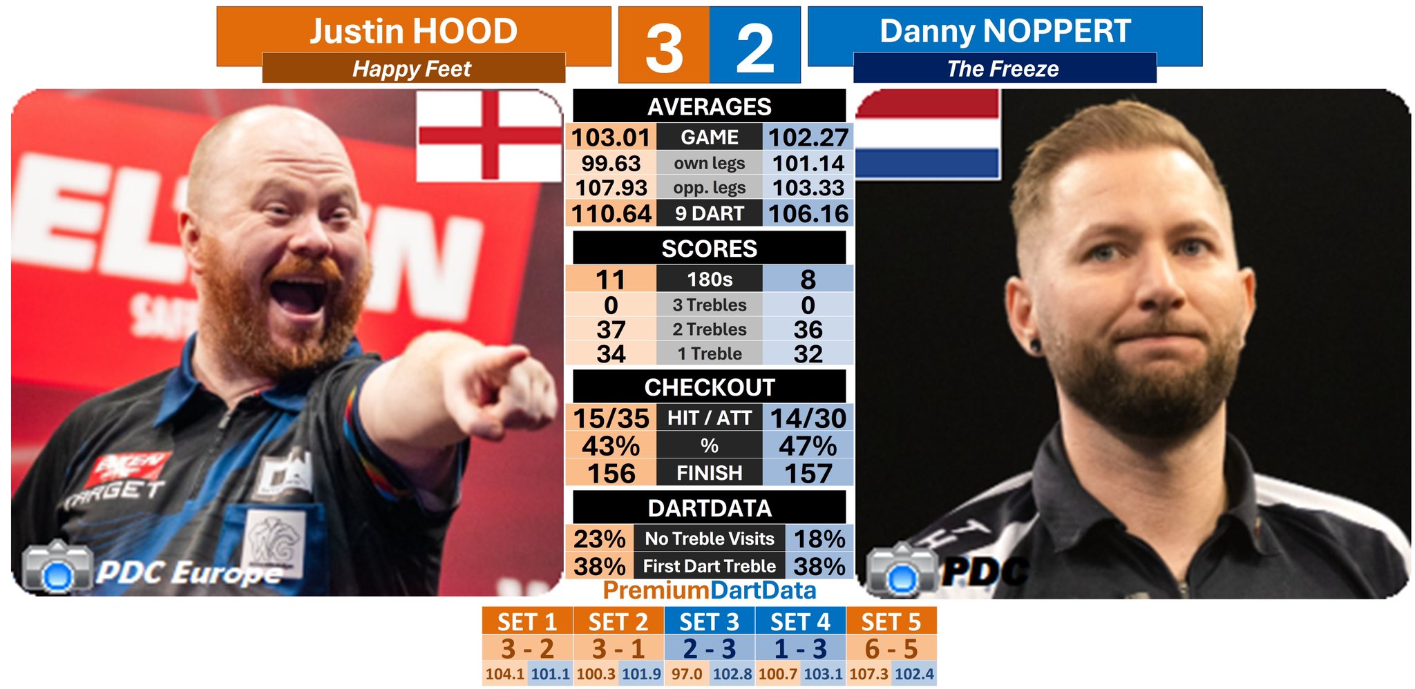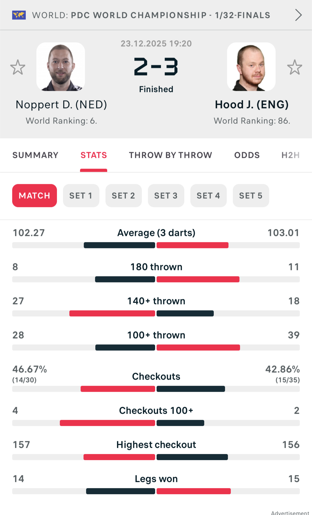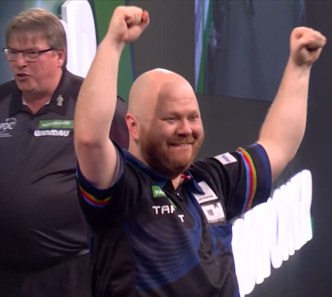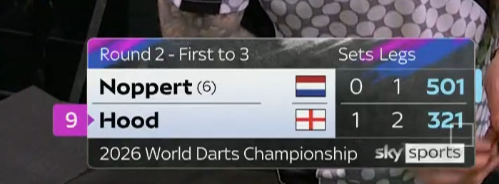 And so that was Day 13 and the end of Round Two. Three more seeds dropped but there is only one place to start.Justin Hood and Danny Noppert played out quite possibly one of the greatest Last 64 games ever seen in the PDC World Championship as Happy Feet melted The Freeze in a sudden death epic. Five straight holds with the set going to the Somerset midget kicked things off with both averaging over the ton. Then the first cracks: Noppert missed 114 on tops twice and Hood punished both times and took Set 2 in 4. Three further holds meant match darts were imminent for Justin and he just missed the bull to win with a 167. Danny then went daft, hitting 102 to level the set and breaking in 11 to trail 1-2 and then running Set 4 in 4 legs for a scarcely believable level game. Then a final set which put Wade-Evans to shame: the Dutchman hitting 126 on D6 to level at 1-1, a 71 break to lead 2-1, his only match dart attempt at D10 to finish 128 which saw the Englishman pin D8 last dart in hand for tiebreak. Hood broke immediately, missed a second match dart and had to watch Noppert slam in a 157 to level once more. Again: Hood break, missed match dart on D16 for a 134, Noppert makes it 4-4. Happy Feet pounds in a 156 out, The Freeze responds with 127 on the dot. Amazingly the sudden death leg saw the debutant dwarf hold in 15 having averaged 107 for the set. Danny Noppert averaged 102, finished at 47% and he was still comprehensively outplayed. Keep this up and Hood has a genuine chance of making it out of this section of the draw.Elsewhere, Peter Wright and his sub-80 average was humiliated 3-0 by Arno Merk, Callan Rydz edged out Daryl Gurney in their own five-set tiebreak classic, Jermaine Wattimena had to hold off a Scott Williams fightback to win 3-2, Jonny Tata threw away a 2-0 lead to lose to Ryan Meikle, Michael van Gerwen and Gary Anderson both won in 4 sets, and Josh Rock also won 3-0.We return 27th December for the Last 32. Have a very merry Christmas /180/.