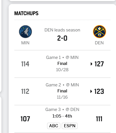 >DEN leads the season>2-0 for the twolves