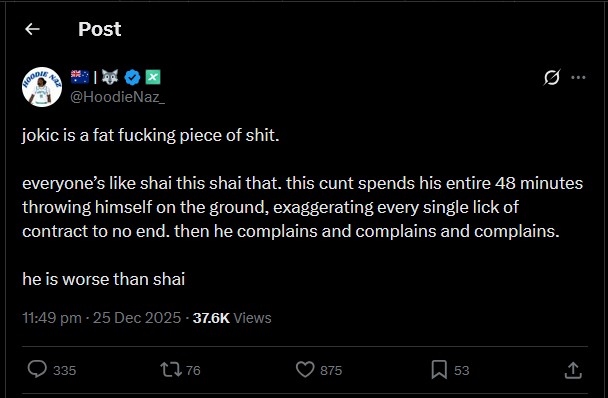 RENAME IT TO "JOKIC A FRAUD EDITION"WITH HOW THYE;RE GONNA DROP A 15 POINT LEAD TO THE WUFFIES HAHAHAHAHHAHAMERRY CHRISTMAS FAGGOTSTHAT FAT WHITE UNATHLETIC CRYBABY IS GETTING BUCKBROKEN TONIGHTTHE WORLD IS HEALING