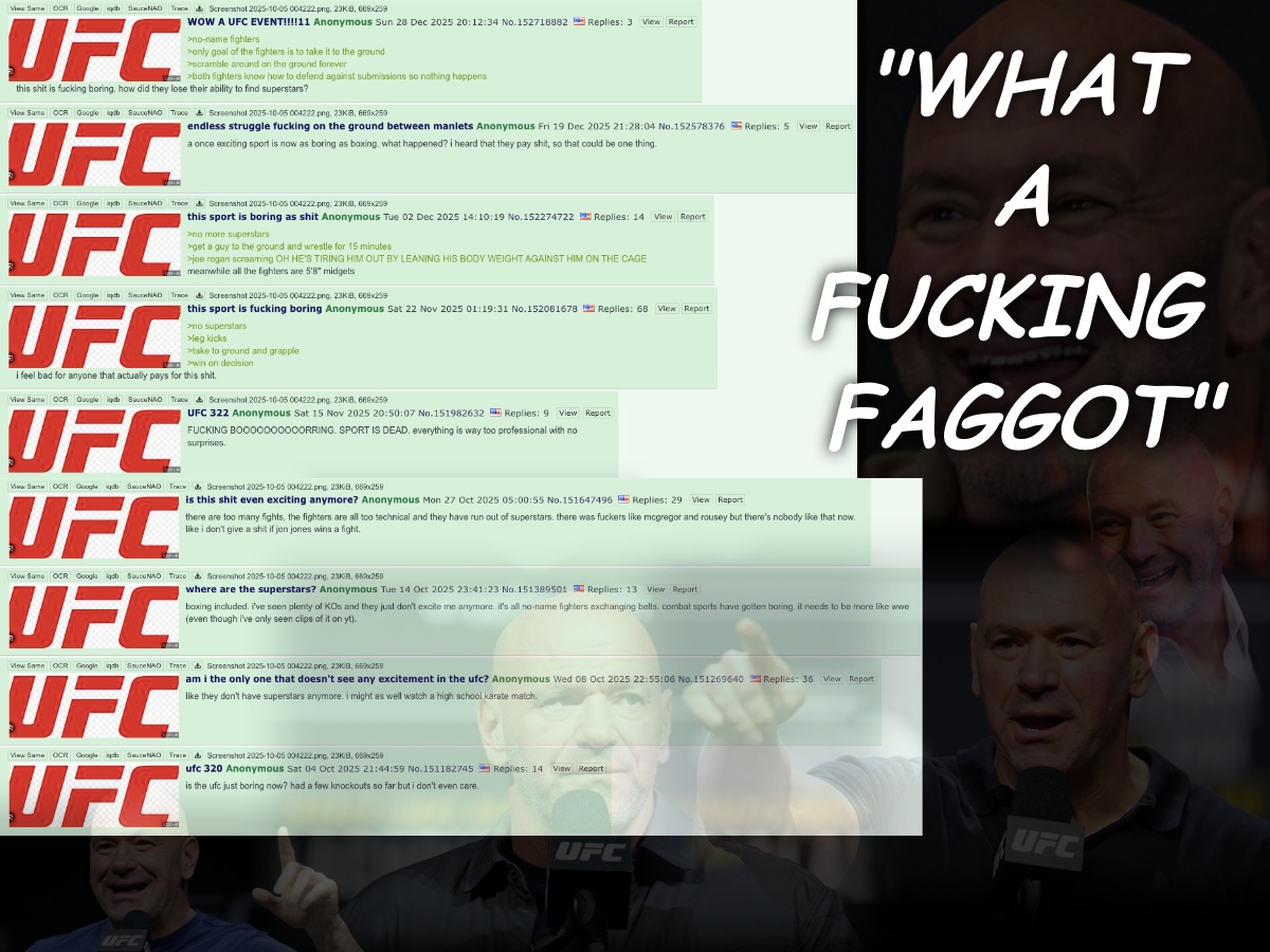 >>152720027>tell me why you disagreeso you are here to argue about the sky being blue, like a chick lol. you realize a fucking jewish talent agency purchased the ufc from mob brothers, in jew vegas, right? you dumb fucking zoomer. the disagreement is this same fag filling the catalog with this basic ass, low effort bait thread, and dumb faggots like yourself admitting to making similar posts. what good has that done? do you support smaller organizations? you just consume jewfc like a good goy. make another thread, so we can bump that too. mma needs to match the number of soccer threads