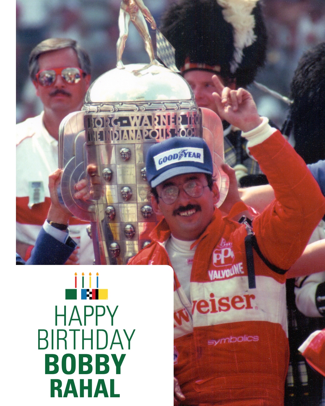 Bobby Rahal>1986 Indy 500 Winner58 Laps led>30 seconds fontana in carhttps://www.youtube.com/watch?v=Zm54FgA4Qhs>60 seconds long beach passhttps://www.youtube.com/watch?v=AWLJ6ebmbB0>150 seconds phoenix in carhttps://www.youtube.com/watch?v=C_UhSNHtq54young jim lampley on the call>4 minutes, end of race + interviewhttps://www.youtube.com/watch?v=_YVzQqLuLzQ
