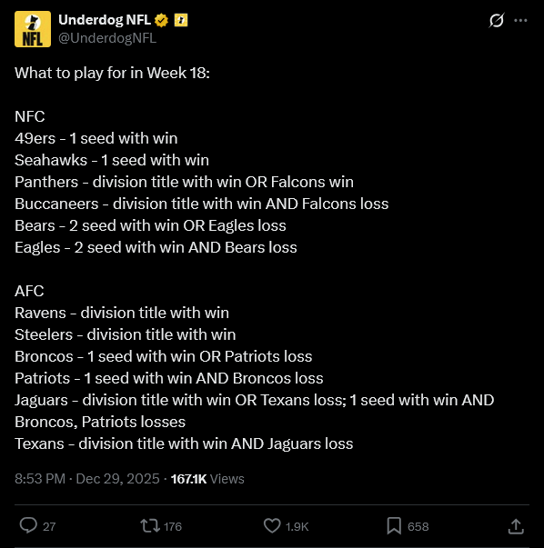 >>152735266To be fair to them, not once in NFL history has a WC team hosted a home playoff game. That would require two WC teams making the conference championship, and that has literally never happened.Still, giving up while seeding is on the line is cuck behavior.