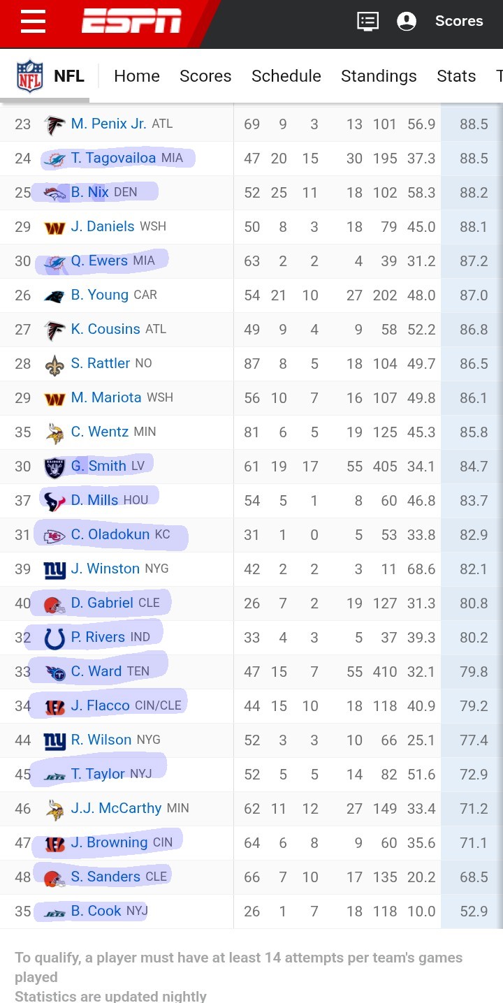>>152736505Combining stats and context is the only real way to evaluate how a qb is doing. You can cheer for shit qbs if you want but don't expect not to get called out for it