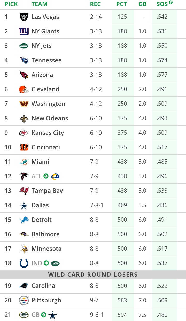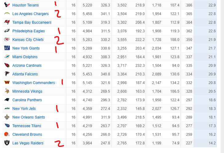 1. 49ers2. Jaguars3. Broncos4. Rams5. Texans6. Bills7. Bears8. Patriots9. Seahawks10. Packers11. Chargers12. Eagles13. Steelers14. Ravens15. Panthers16. Bucs