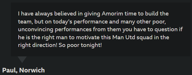 >>152751394There's no reason to wait and see if he changes. Literally no reason to delay. The team right now, with players missing, is better suited to 4-3-3 / 4-2-3-1. The team with everyone back from AFCON is also better-suited. Every single game we go into with this terrible setup is just pissing points and potential away.The abject boredom and sense of void-shouting futility has becoming incredibly draining; it's bred in me a sort of emotionless detachment that's hard to quantify. With Ten Hag, it was obvious that he was going to go and the torment would soon end. It couldn't continue and nobody was around to claim that it was part of the plan. With Amorim, though, all we have is some sort of robo-wall rebounding echo of "it's part of the plan" from our untouchable, seemingly flawless overlords. We have no ability to influence this, because their staunch, resolute sense of correctness won't let any outside noise in. In essence, we're praying for change every week; we all know we need to see change; we have no indication that we will see any change.Until then, expect failure. We're setting up for it in almost every game.