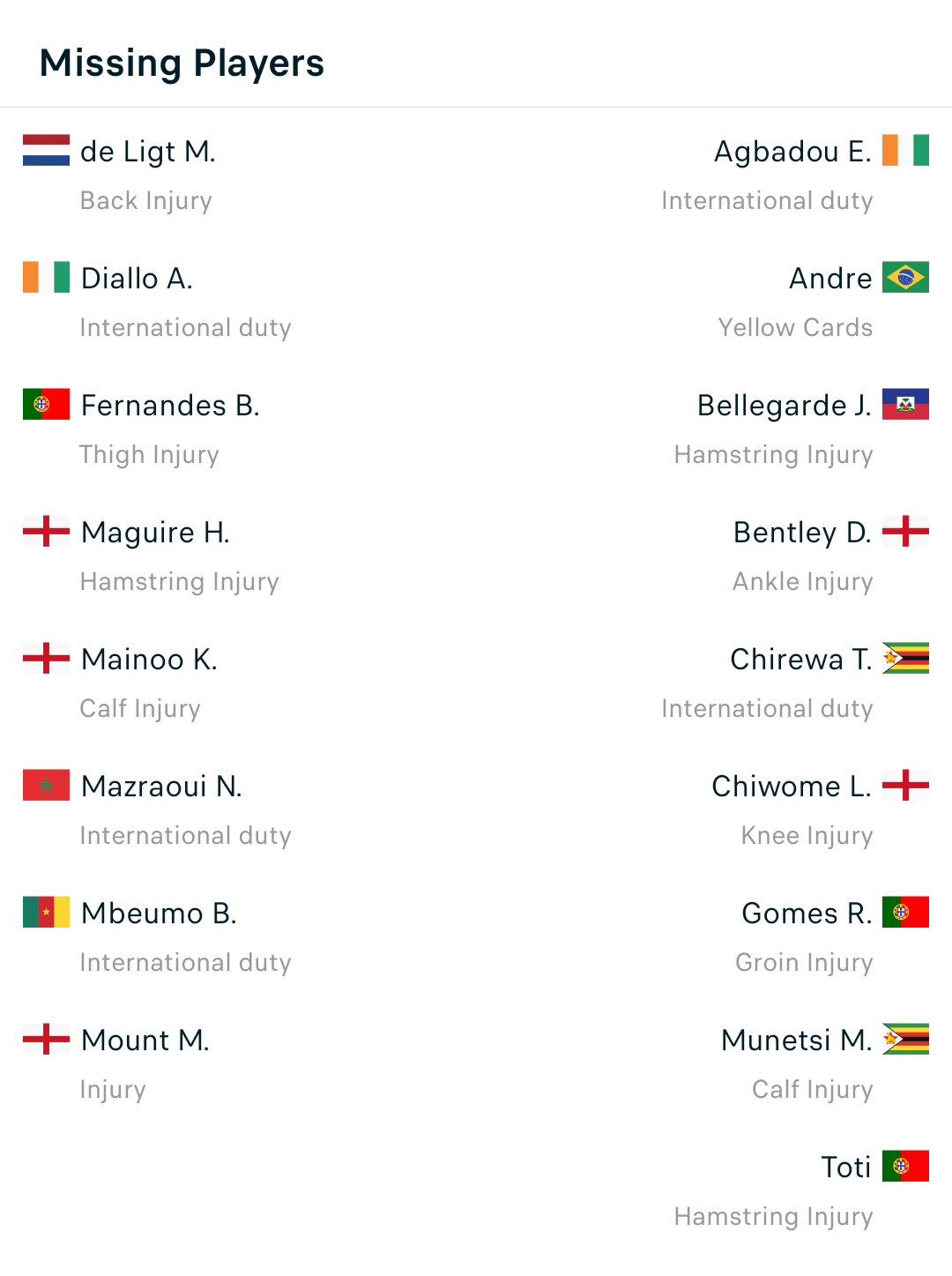 >>152750100Not an excuse (it is) but United had none of their attackers that scored against Wolves in the 4-1 win just a few weeks ago. Fernandes is injured, Mbeumo is at AFCON, Mount in injured.