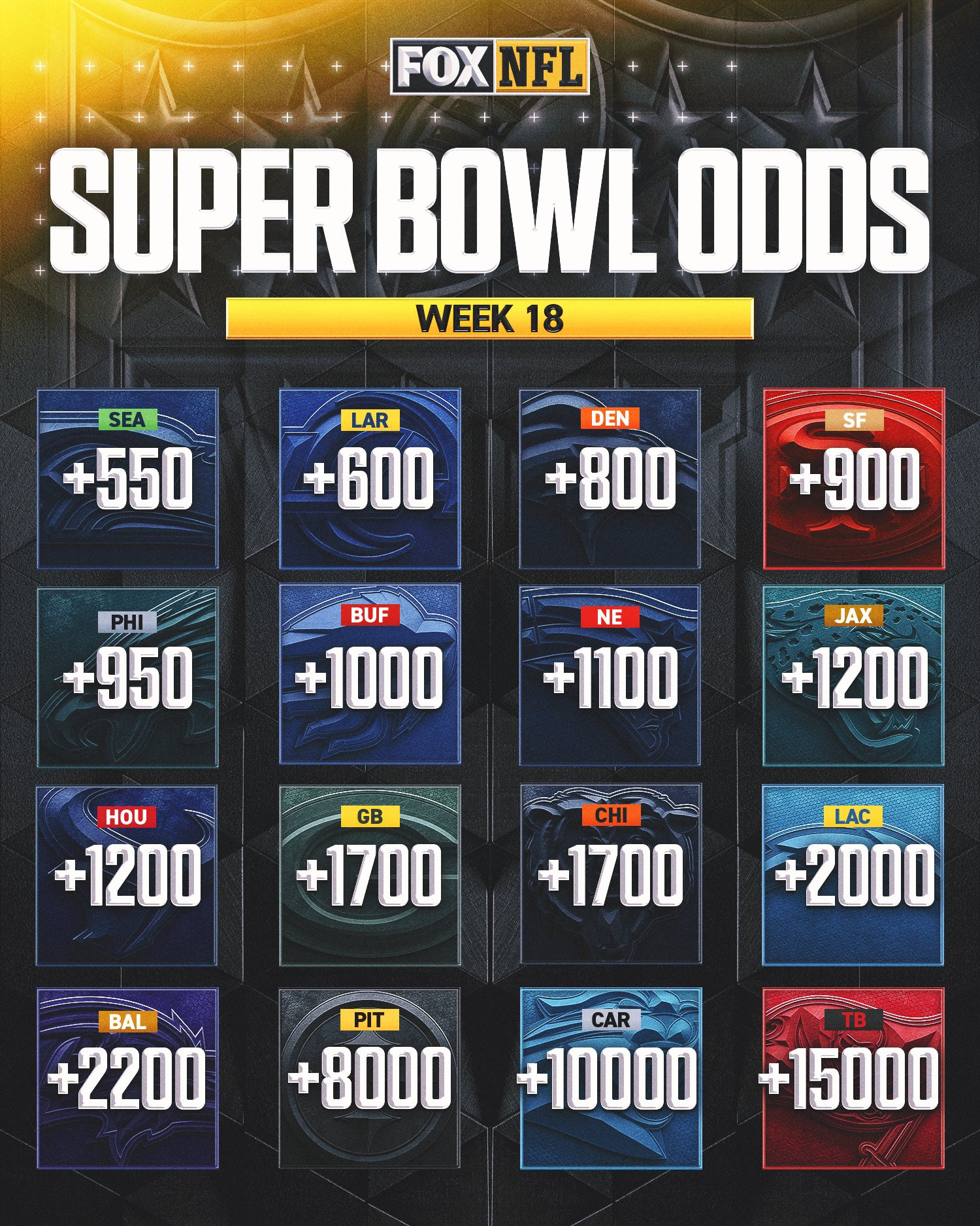 OFFICIAL /nfl/ Week 18 power rankings!1. Seattle Seahawks 2. New England Patriots 3. San Francisco 49ers4. Jacksonville Jaguars 5. Los Angeles Rams 6. Denver Broncos 7. Philadelphia Eagles 8. Houston Texans9. Buffalo Bills10. Chicago Bears11. Los Angeles Chargers 12. Baltimore Ravens13. Green Bay Packers 14. Carolina Panthers15. Minnesota Vikings 16. Detroit Lions17. Pittsburgh Steelers 18. Cincinnati Bengals19. Atlanta Falcons 20. Indianapolis Colts21. Tampa Bay Buccaneers 22. Dallas Cowboys 23. Miami Dolphins 24. New Orleans Saints25. Tennessee Titans 26. Kansas City Chiefs 27. Cleveland Browns28. Washington Commanders29. New York Giants 30. Arizona Cardinals31. New York Jets32. Las Vegas Raiders