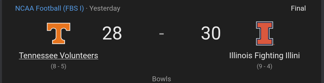 >>152746846Reminder that Tennessee hasn't beaten a single FBS team with a winning record this season. Meanwhile Illinois beat 5 which includes the ACC and MAC Champion.