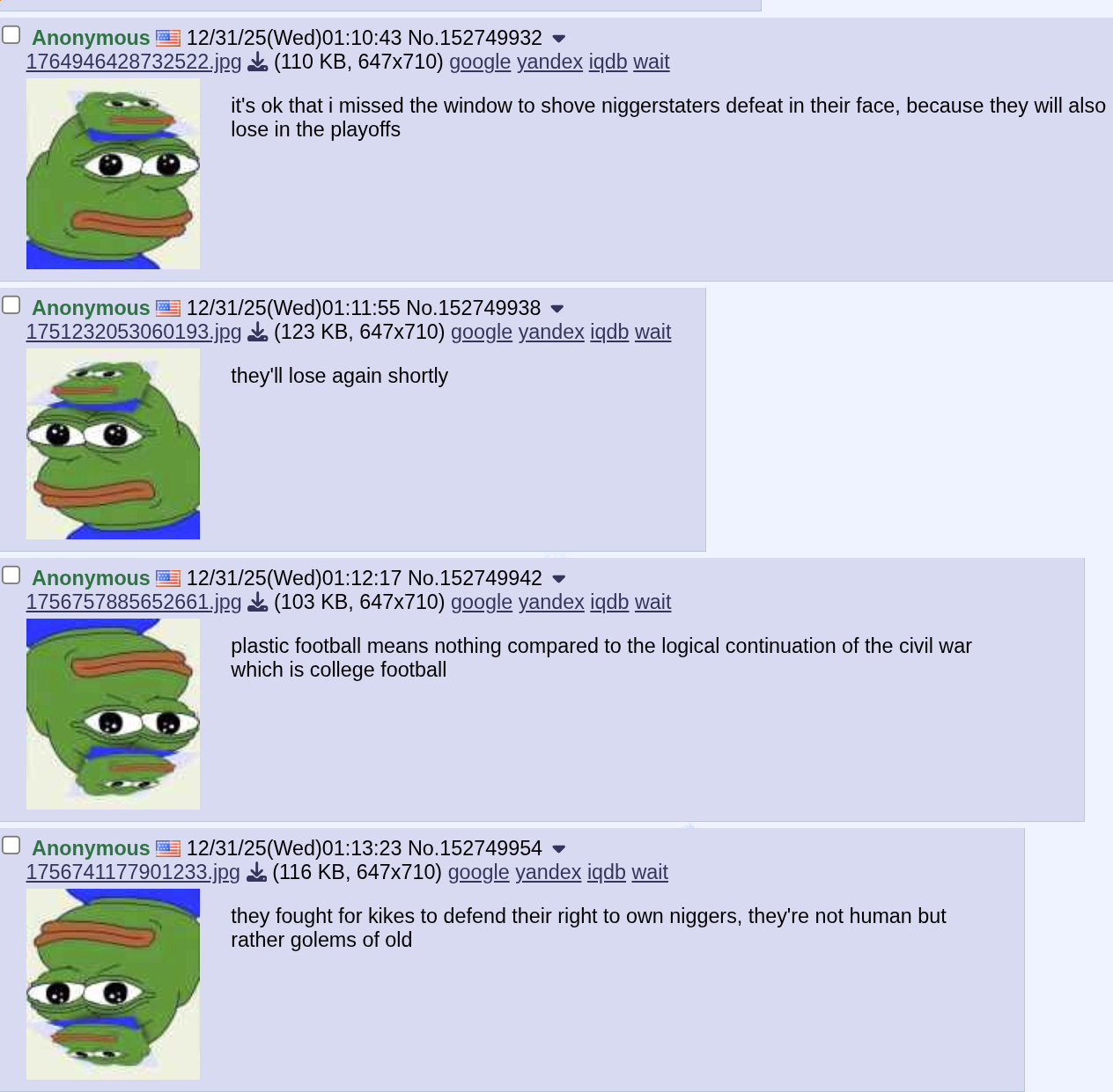 SPORT IS A PROXY FOR WARYOU ARE NIGGERSTATERSYOU ARE RULED BY KIKESYOU FOUGHT AND KILLED WHITE MENTO DEFEND THE RIGHTOF KIKESTO OWN NIGGERSWHO RUIN YOUR LANDSYOU ARE THE ENEMY YOU ARE THE CANCER