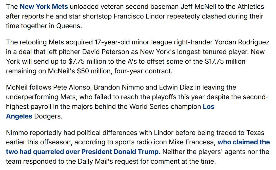 >>152753267NY Post headline politicizing Lindor getting a new apartment. Instead of just saying "Lindor gets expensive penthouse" it was "Lindor and Mamdani-appointed wife get expensive penthouse" to make it sound sinister, or at least sinister to the average NY Post reader.