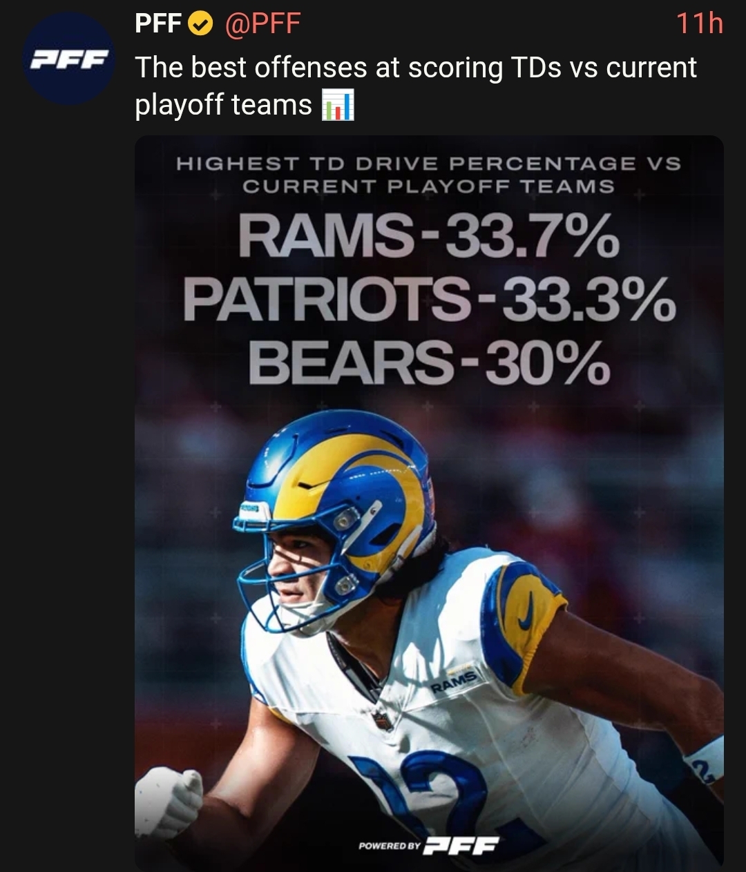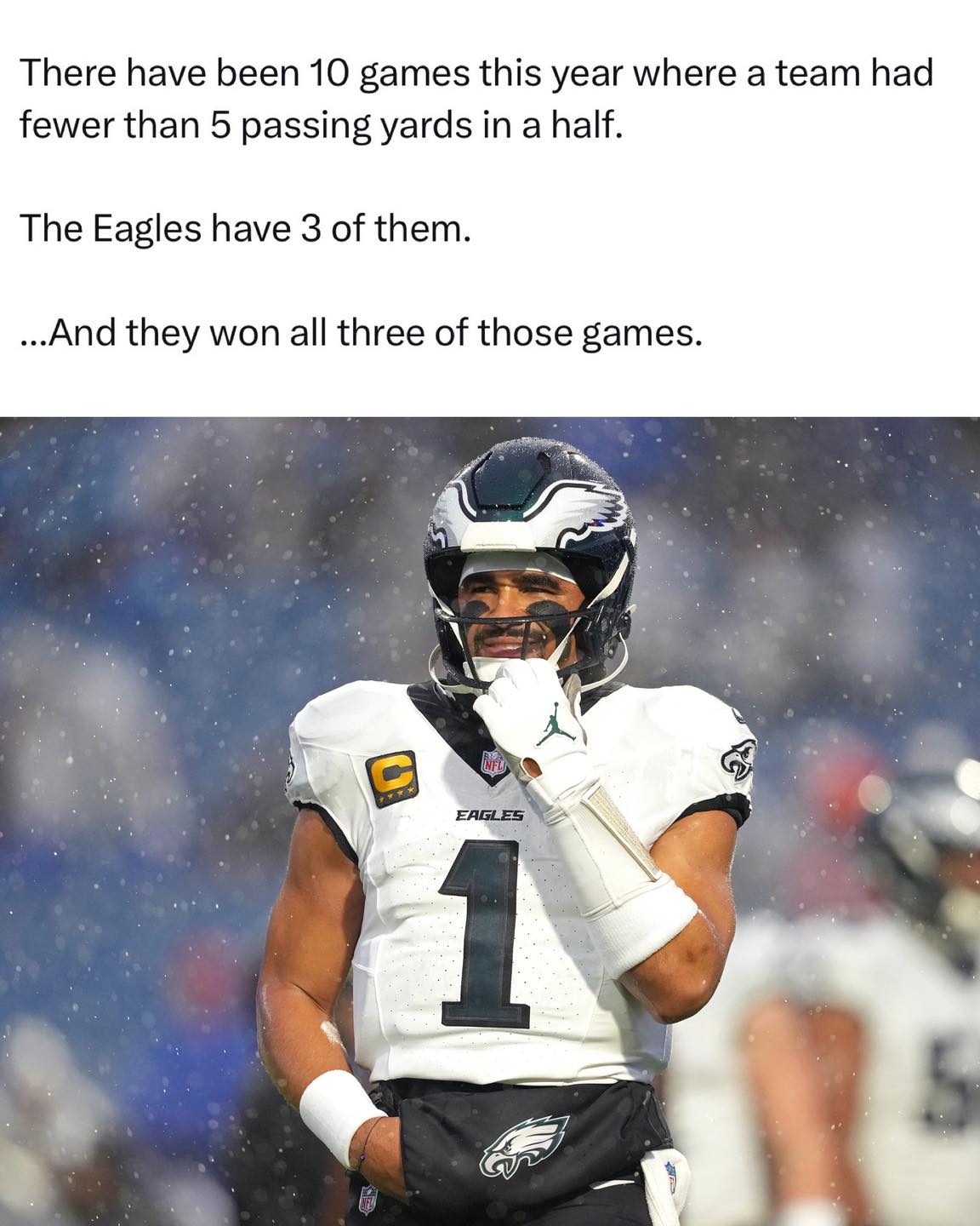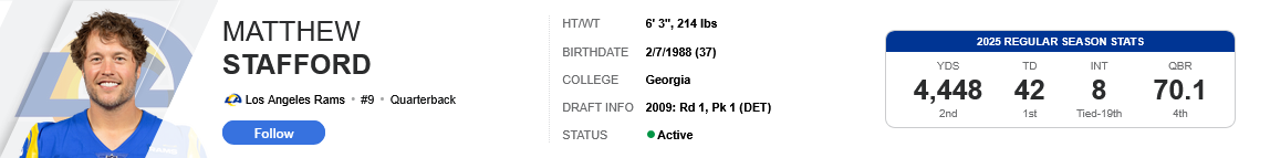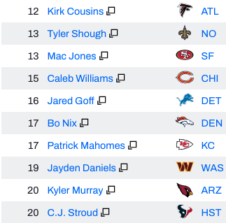 sam darnold has more yards than box nix, a better completion percentage than stafford, a better QBR than caleb williams, a better passer rating that jalen hurts and more TDs than josh allen, jalent hurts, bo nix and caleb williams