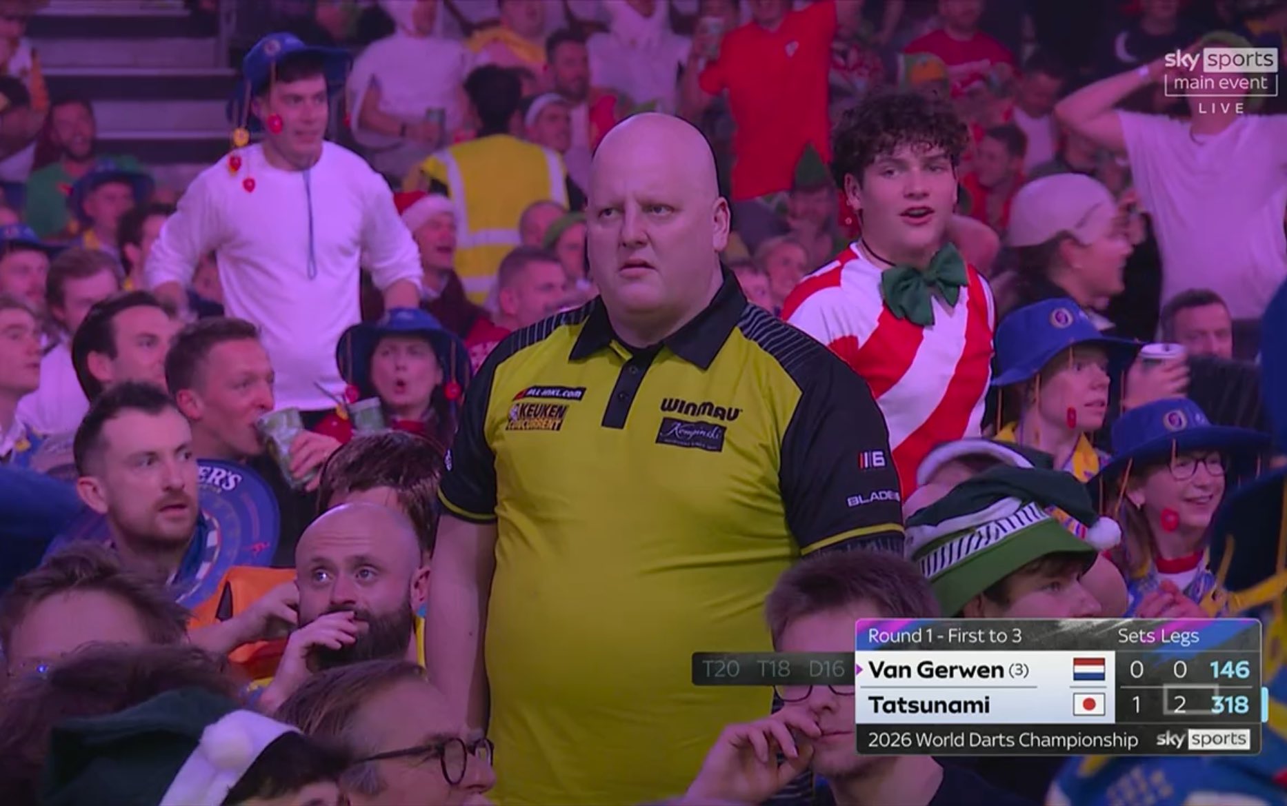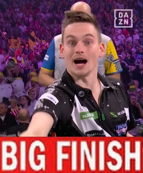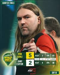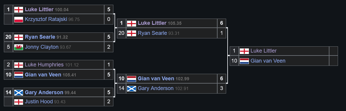 And so that was Day 19. One semi-final was almost a complete walkover, the other an absolute classic that saw the first 9 set semi in 4 years. Let's start with the latter.Gian van Veen and Gary Anderson produced an astounding match at Ally Pally that saw the young Dutchman emerge victorious with both averaging almost 103. The Giant won the bull but lost the opener as The Flying Scotsman won 3 legs in 44 darts to immediately break back. Van Veen responded to re-break with a 10 darter and pinned 117 to level up. Five straight holds gave the Dutchman a 2-1 lead. Despite starting set 4 off with a 144 out, Anderson could not break his opponent's throw and saw Gian slam in an 11 darter to break in the decider and go 2 clear. Then the chaos of Set 5: Gary 10 dart break followed with a 170, only to lose throw to another 170 2 legs later and then a vital last dart D4 from GVV for a 3 set gap. The Scot closed the gap with a nice 81 on the bull to make it 4-2, and then what looked to be the gamechanger: waiting on 67 to lead 5-2, Gian missed two at D8 and Gary pinned a last dart D1 before breaking in 14 to make it 4-3. Incredibly, that would be the final set he won as despite coming from 0-2 and surviving 4 set darts, his throw collapsed and GVV finished 59 to go one away. Three misses at D16 to break in Set 9's opener for Gary were punished and despite breaking back with a beautiful 121 at 0-2, he missed the bull on 126 for 5-4 and Gian served out in 13, finishing on D16.Luke Littler dropped the opener against Ryan Searle and then proceeded to annihilate his compatriot in a terrifying display. The Nuke binned 3 darts to break Heavy Metal in leg 3 of set 1 and lost it. What followed was obliteration as Searle won just 5 more legs (but did finish a 170 in the final set!) with Littler winning 11 straight legs at one point and averaging 105, over 12 points higher than his opponent managed in the end.The Final is at 7:30pm tomorrow in the Ultimate Battle of Chud vs. Evil.