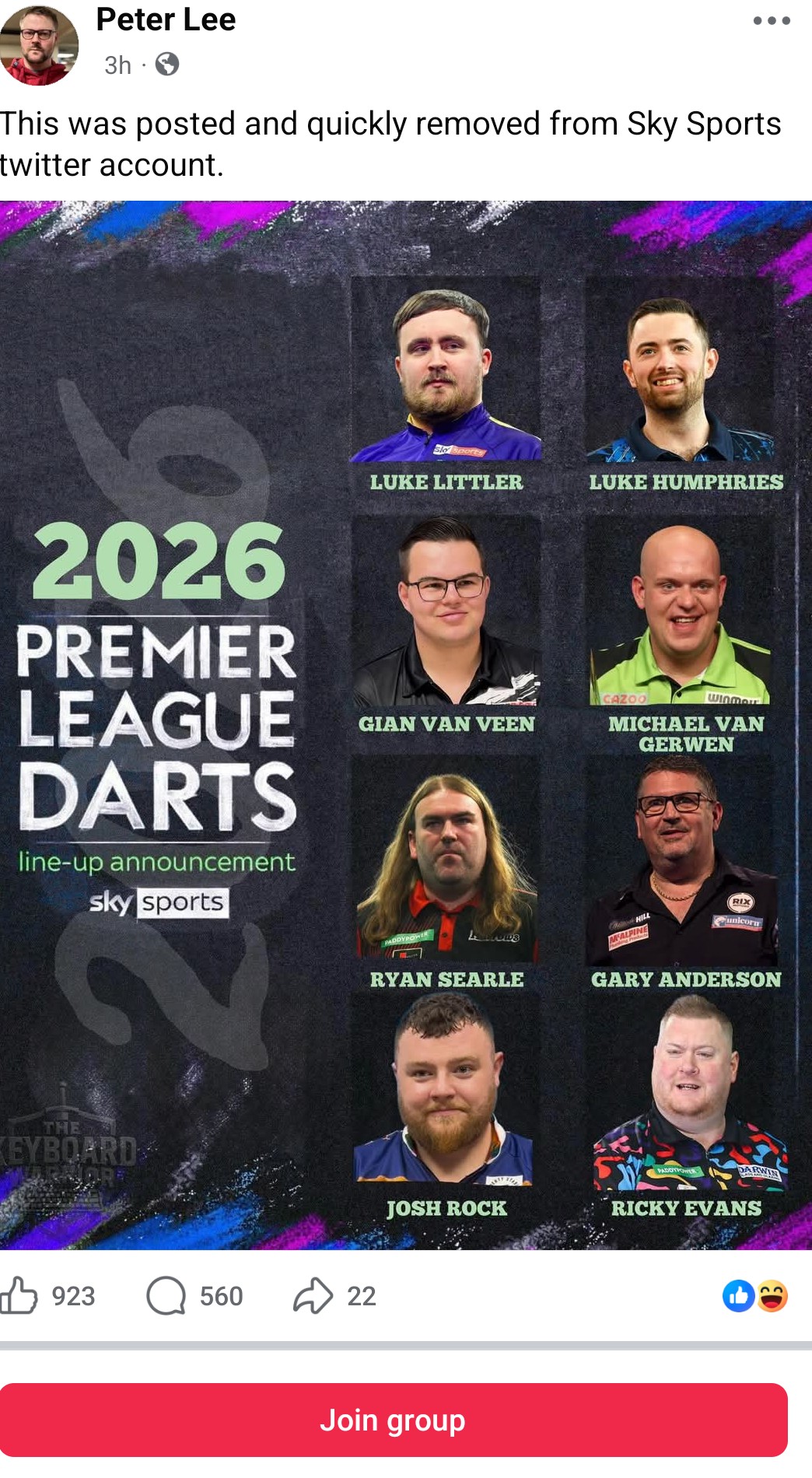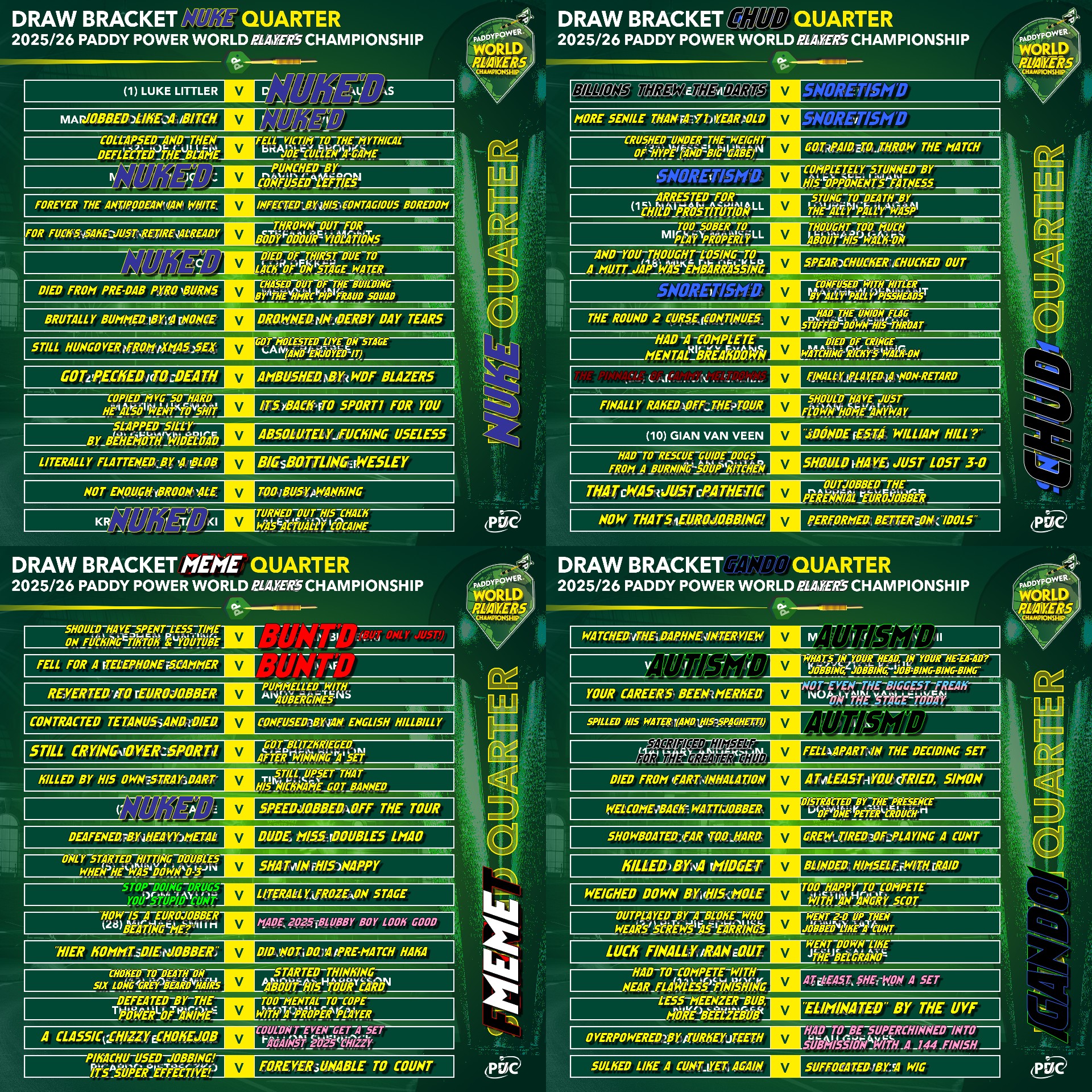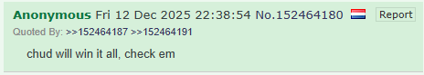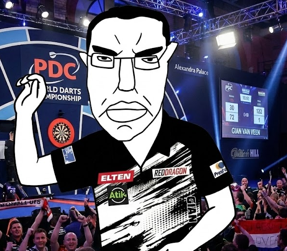 >(10) Gian van Veen v (14) Gary AndersonMan, that's tough, can't they both win? By the way: What a luxury to have a WC semi where you want both players to advance. But, I have to say, as much as I love Gando: I think it's the year of the Chud, and I like to believe the script for this year is the end of the darting dark ages: After Clown World, Ice Age, Clown World 2, Flubber and Littlerwinslol, the Rise of the Chud will mark the dawn of a new era, where the forces will be balanced again.