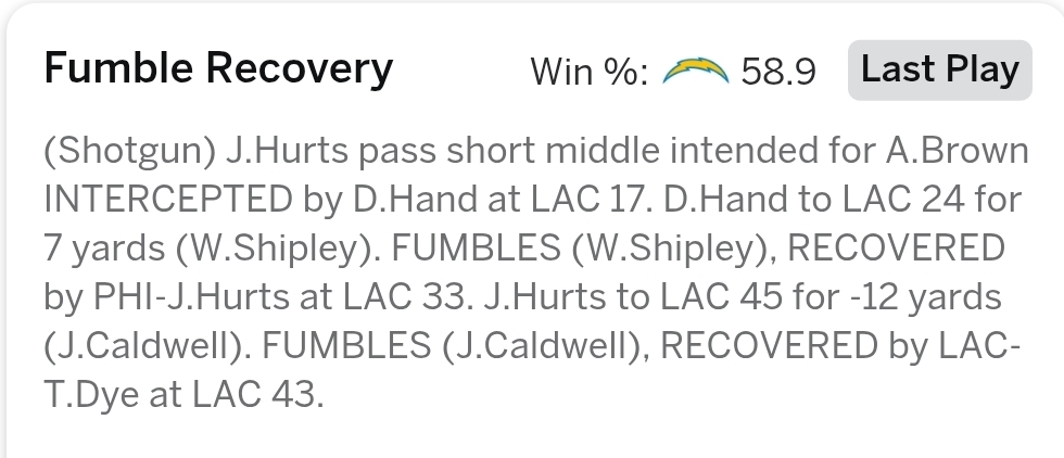 >>152783478see >>1527834675 plays later, the Eagles threw an inteception, and the following play the chargers fumbled again6 turnovers in the span of 8 plays