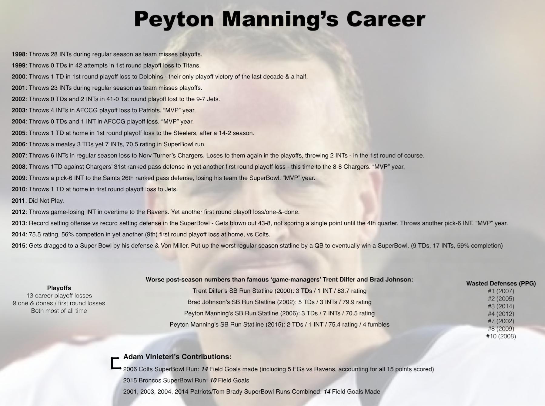 Manning with his useless broken body coached and controlled the offensive and didnt screw up so the godtier defense could do their thing and they won an owl. His football IQ is unmatched, but after his neck and spine injuries that was all he had left. Still got owls tho. Peyton a top 2