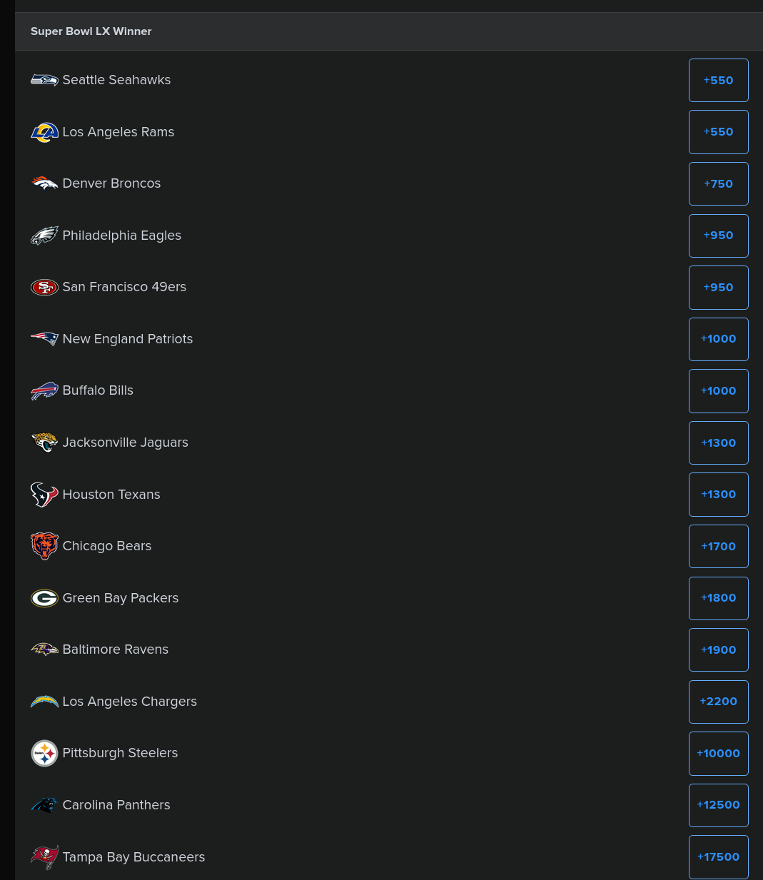 VEGAS ODDS FOR MAKING SBAFC#1 Broncos 25%#2 Patriots 18%#3 Bills 17%#4 Jaguars 13%#5 Texans 12%#6 Ravens 8%#7 Chargers 6%#8 Steelers 1%NFC#1 Seahawks 25%#2 Rams 24%#3 49ers 17%#4 Eagles 16%#5 Bears 9%#6 Packers 7%#7 Panthers 1%#8 Buccaneers 1%Vegas is firmly on the Allen and Stafford train apparently. Feels disrespectful to the Jaguars, 49ers, and Eagles.