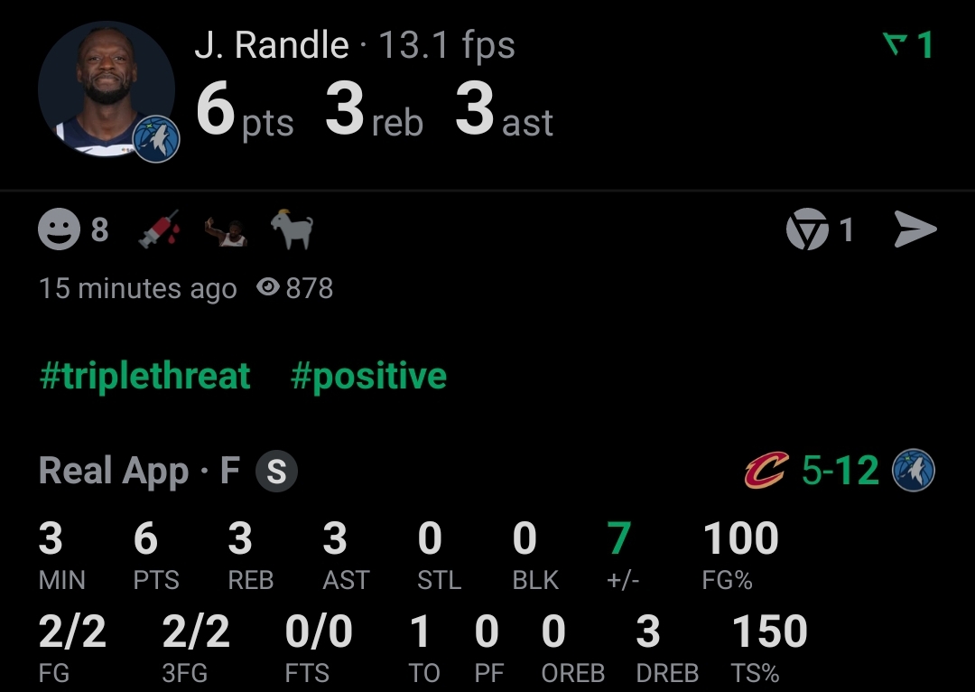 Randle>28 pts>3-7 3pt>11 rebs>8 asts>+31Ant>25 pts>10-20 fg>4-7 3pt>7 rebs>9 asts>1 stl>1 blk>+19McDaniels>26 pts>11-16 fg>3-4 3pt>5 rebs>1 ast>2 stls>+12DDV>22 pts>8-13 fg>6-10 3pt>1 rebs>4 asts>1 stl>+15Fraudass cavs really made 4 wolves players having 20+ pts