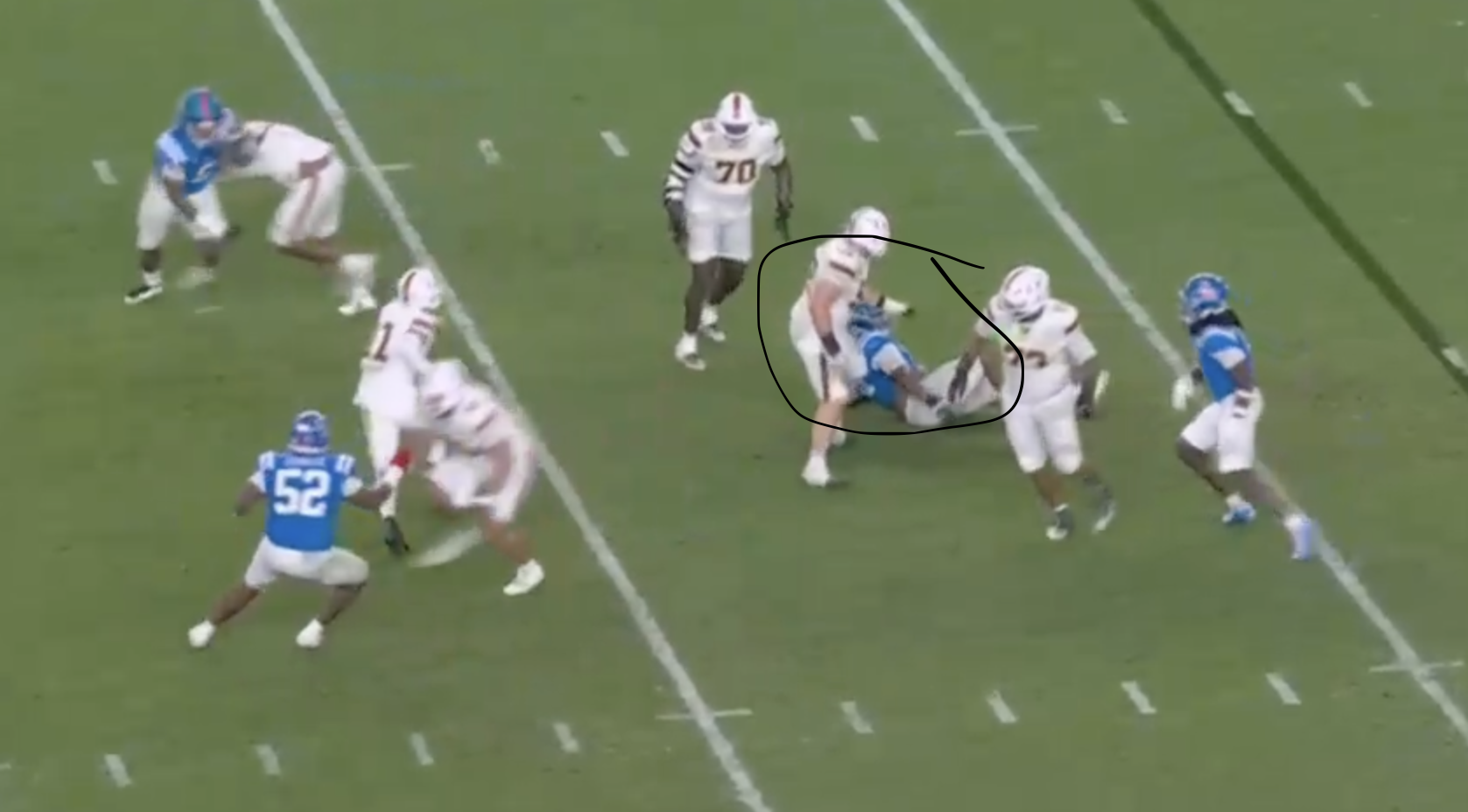 This circiled LB here. This lost them the game. He should have filled the empty space to Beck's left. He should have been coached to know that Beck A) can't throw on the run with ANY confidence to the leftB) is a 2nd read QB at BEST at all phases of the game and at BEST a late emergency option QB in extended play scenario's (3+ seconds TtP [Time to Pass]This is bad coaching whitch LANE KIFFIN nwould have prepared his team for. If Lane were coaching the Ol' Miss Runnin' Rebels'They would be preparing for the championship game rihgt now.