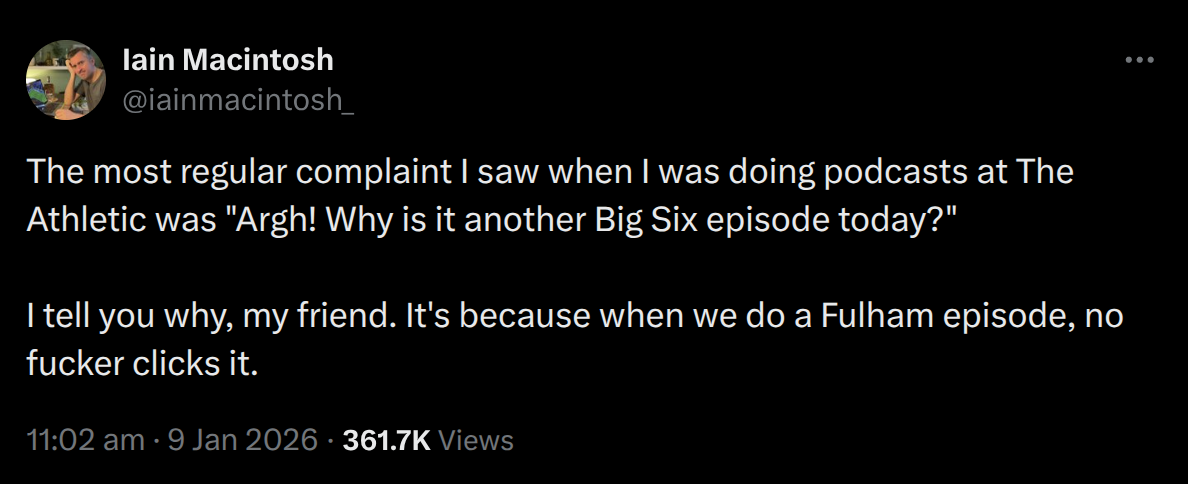 >Of the biggest clubs in Europe's top league none have gone as long as Liverpool without winning the title 30+ yearsLiverpool talking about being a big club is like if Mongolia was talking about being an empire because Genghis rekt some farmers 1000 years ago.