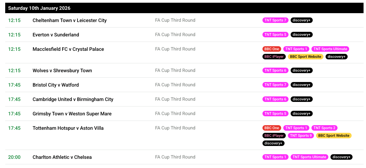 jfs do one>Friday 9th January 20267.30pm Milton Keynes Dons v Oxford United7.30pm Port Vale v Fleetwood Town7.30pm Preston North End v Wigan Athletic7.30pm Wrexham v Nottingham Forest >Saturday 10th January 202612.15pm Cheltenham Town v Leicester City12.15pm Everton v Sunderland12.15pm Macclesfield v Crystal Palace12.15pm Wolverhampton Wanderers v Shrewsbury Town3pm Boreham Wood v Burton Albion3pm Burnley v Millwall3pm Doncaster Rovers v Southampton3pm Fulham v Middlesbrough3pm Ipswich Town v Blackpool3pm Manchester City v Exeter City3pm Newcastle United v AFC Bournemouth3pm Salford City v Swindon Town3pm Sheffield Wednesday v Brentford3pm Stoke City v Coventry City5.45pm Bristol City v Watford5.45pm Cambridge United v Birmingham City5.45pm Grimsby Town v Weston-super-Mare5.45pm Tottenham Hotspur v Aston Villa8pm Charlton Athletic v Chelsea >Sunday 11th January 202612pm Derby County v Leeds United2pm Portsmouth v Arsenal2.30pm Hull City v Blackburn Rovers2.30pm Norwich City v Walsall2.30pm Sheffield United v Mansfield Town2.30pm Swansea City v West Bromwich Albion2.30pm West Ham United v Queens Park Rangers4.30pm Manchester United v Brighton & Hove Albion >Monday 12th January 20267.45pm Liverpool v Barnsley