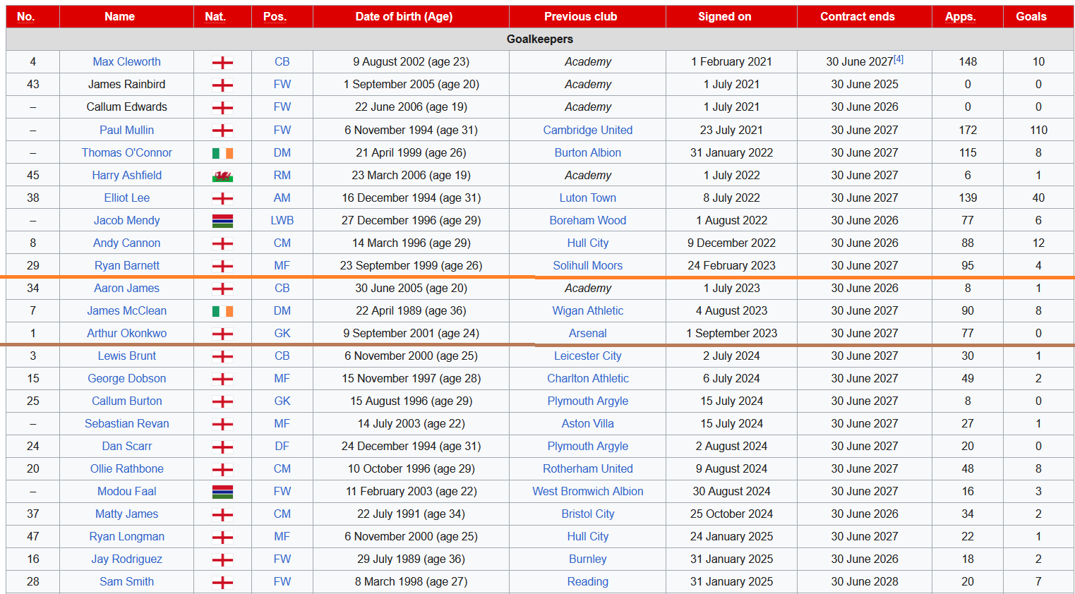 >>152886820Okonkwo is actually decent. Danny Ward was the problem.>Wales and Wrexham goalkeeper Danny Ward says he is aiming to return to action "around January time" after undergoing surgery on an elbow injury.>But the 32-year-old was carried off with a dislocated elbow in just the fourth league game of the Championship campaign at Millwall in late August.For Wrexham fans' sakes they'd best hope he has a setback.>>152886916https://en.wikipedia.org/wiki/2025%E2%80%9326_Wrexham_A.F.C._season, sort by "Date Signed".The ones above the orange line were signed in their National League days. The ones above the brown line are the League Two campaign. The ones below the brown line are the League One campaign. I deliberately cut it off at the end of 24/25 because obviously everyone signed after that date is in the current side.