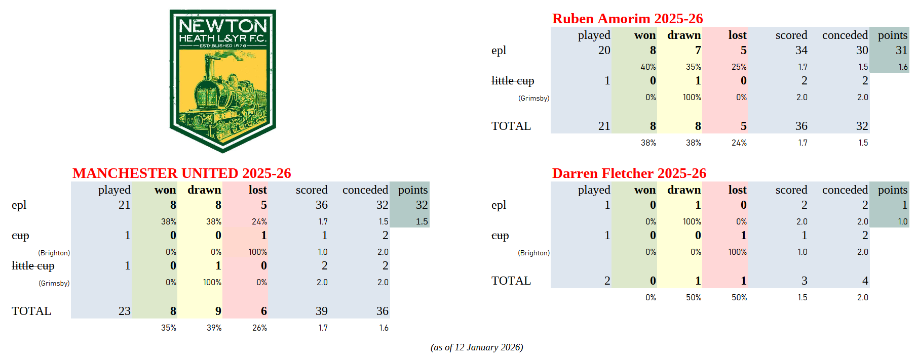 >Amorim 25-26>WBurnley, Chelsea, Sunderland, Liverpool, Brighton, Crystal Palace, Wolves, Newcastle>DFulham, Grimsby, Nottm Forest, Tottenham, West Ham, Bournemouth, Wolves, Leeds>LArsenal, Man City, Brentford, Everton, Aston Villa>Fletcher 25-26>W>DBurnley>LBrighton