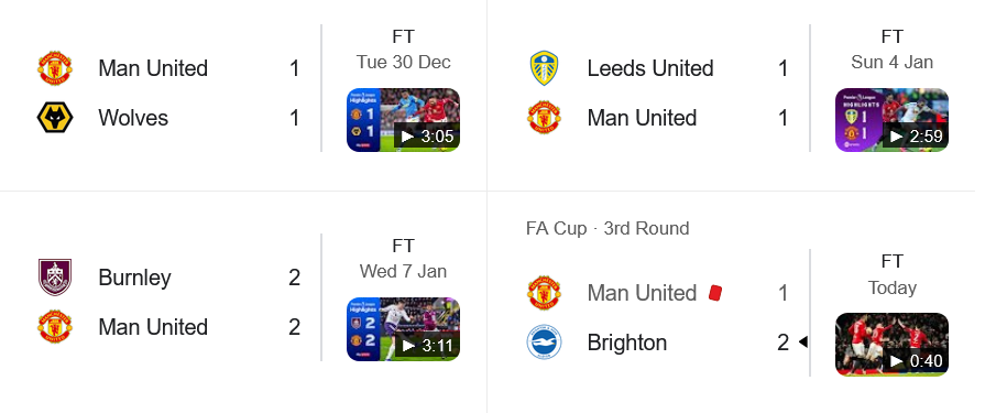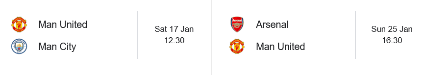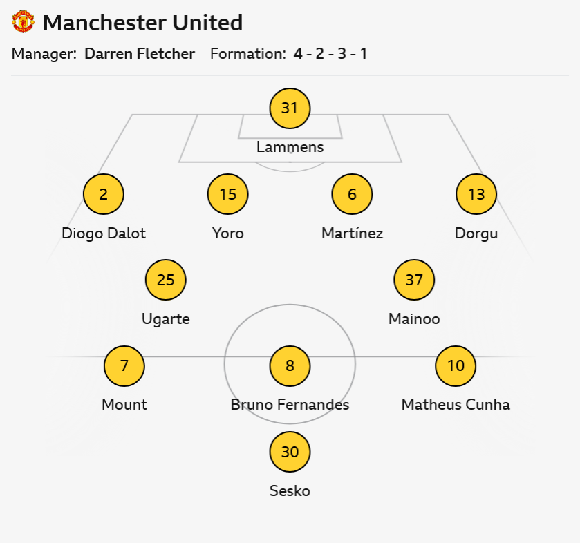 >Amorim 25-26>WBurnley, Chelsea, Sunderland, Liverpool, Brighton, Crystal Palace, Wolves, Newcastle>DFulham, Grimsby, Nottm Forest, Tottenham, West Ham, Bournemouth, Wolves, Leeds>LArsenal, Man City, Brentford, Everton, Aston Villa>Fletcher 25-26>W>DBurnley>LBrighton