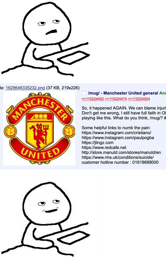 So, it happened AGAIN. We can blame the Glazers, we can blame Amorim, we can praise INEOS's effort but the truth is it's simply not enough. Recruitment, vision, you name it, it all stinks.Don't get me wrong, I still have full faith in Sir Jim and the lads, but a MASSIVE appointment is desperately needed in January. Otherwise I'm not very optimistic about finishing 5th, or the FA Cup for that matter. Not playing like this. What do you think, /mug/? #SouthgateIN or #OlesAtTheWheel?Some helpful links to numb the pain:http://store.manutd.com/stores/manutd/enhttps://www.mtfsurgery.net/dilation.htmhttps://jlingz.comhttps://www.redcafe.nethttps://www.nhs.uk/conditions/suicide/