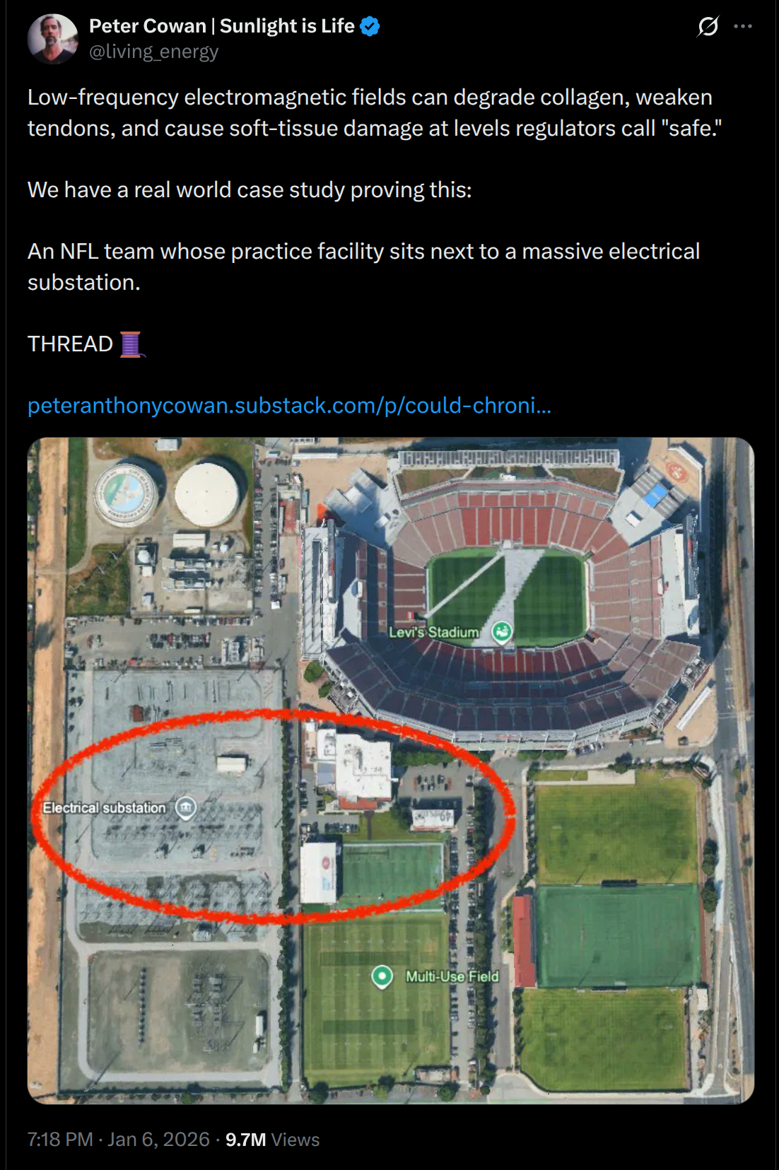 >>152931574>Could Chronic EMF Exposure from a Nearby Substation Be Causing the 49ers' Epidemic of Tendon Ruptures?” -Jan 5, 2026I thought you were joking