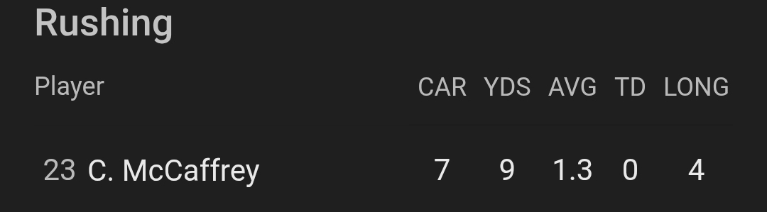 >>152931653>CMC averaging 3.5 yards per carryHe's hardly carrying the ball, let alone the team
