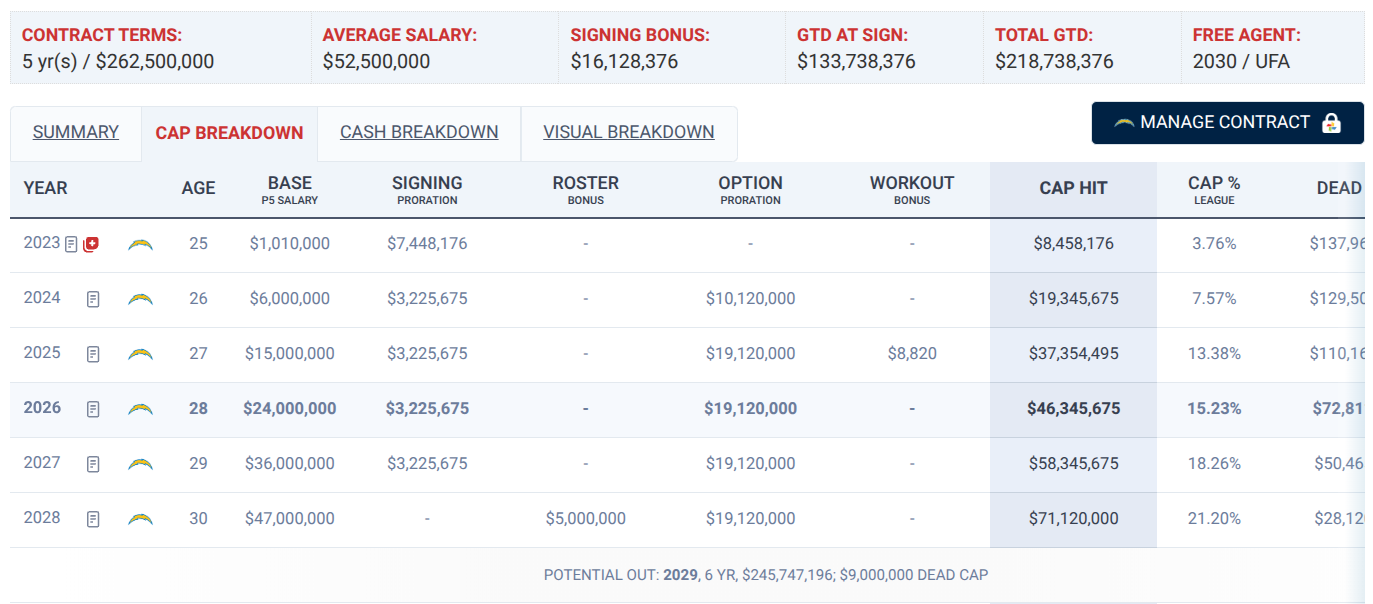 he's a big CHARGER in terms of his cap hit