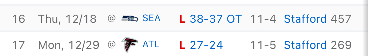 >>152942548Everybody forgets that Stafford can be incredibly anti-clutch at times, especially in the postseason.