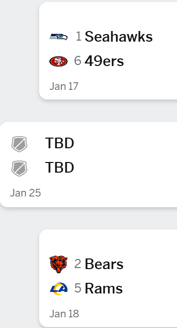 >>152942358what are they vs each other? the seahawks have it the hardest. they have to go through both the ram and the niner which is weird seeing how the seahawks were the #1 seed