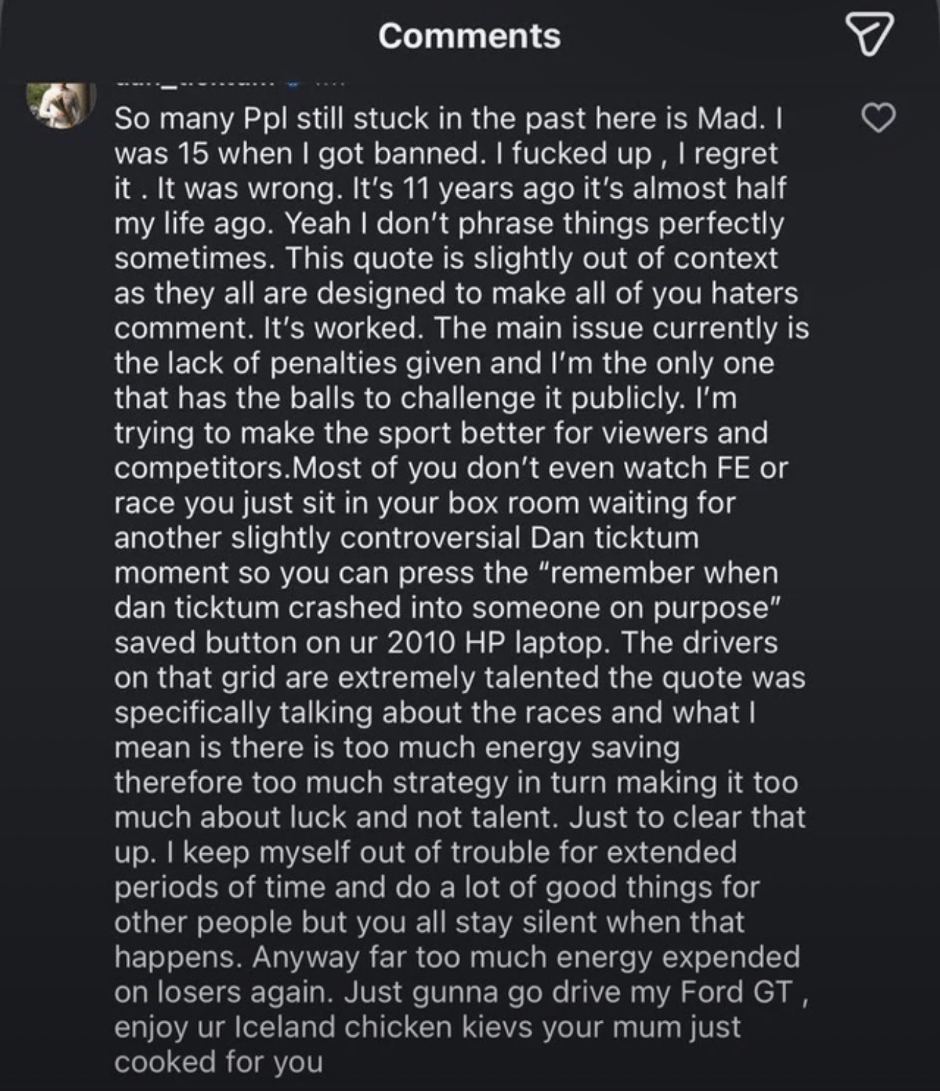 >>152947062so so so so so>autosport bashed this >>152945812 together from multiple radio messages (so, out of context at best)>then deleted this clearly reasonable comment by DAN!>autosport deleted their own post with the at-best-out-of-context quoteautosport probably shouldn't be doing any of that if they want to be taken seriouslybut it doesn't end there:>DAN! made a video in response to the deletion of his comment https://video.twimg.com/amplify_video/2010720517721104384/vid/avc1/590x1280/1QPU_DkXIbBIIuH6.mp4what a controversy!
