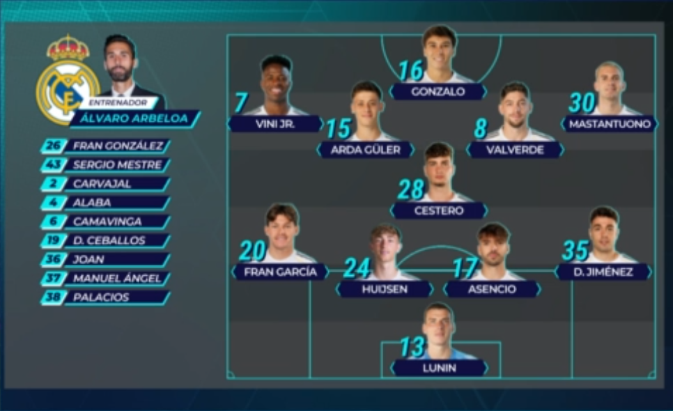 Madrid once:>Lunin; David Jiménez, Asencio, Huijsen, Fran García; Cestero, Güler, Valverde; Mastantuono, Vinicius y Gonzalo.Albacete once:>Lizoain; Aguado, Javi Moreno, Neva, Dani B; Meléndez, Pacheco, Javi Villar, Capi, Lazo y Escriche.