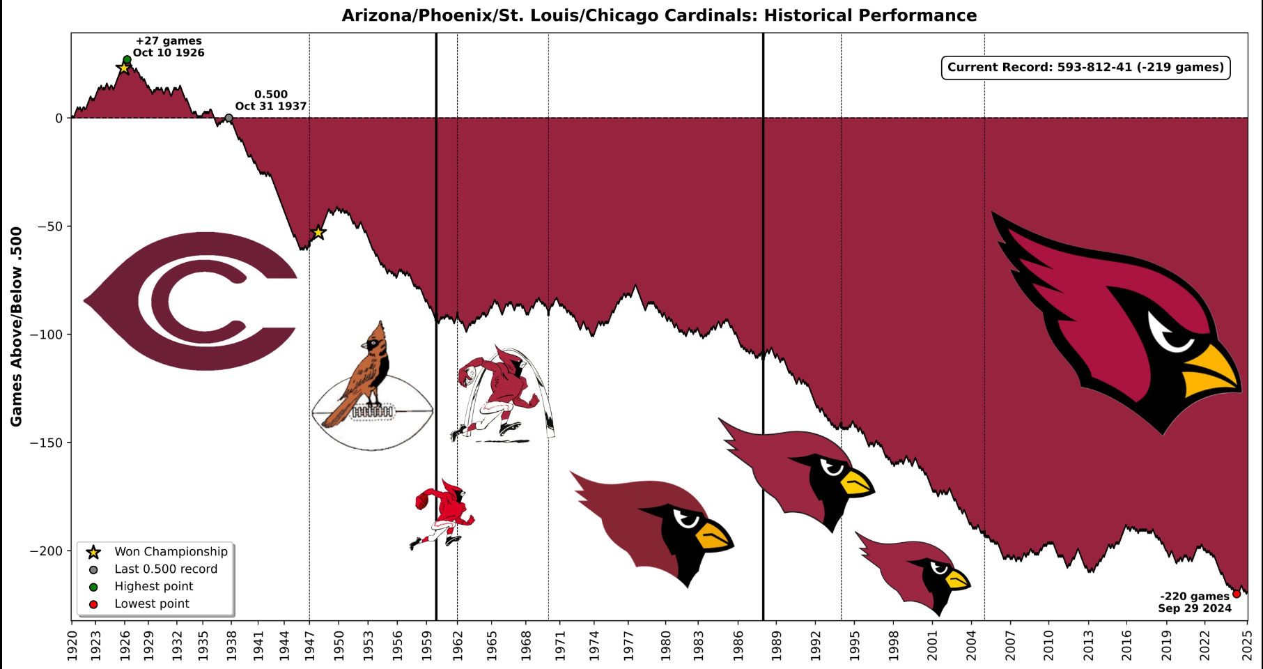 >>152981454Found it, super interesting actually, lots of teams that have never passed the .500 mark, either above or below. And lots of teams that we think of as historically good either didn't start out that way or are furiously trying to dig themselves out of the hole.https://imgur.com/a/nfl-teams-historical-performance-RSodTbm
