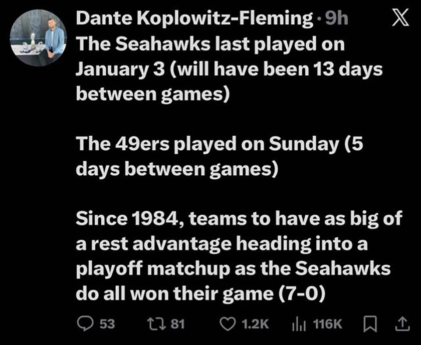 Pretty crazy that if the 9ers win this weekend, they can potentially have 2 games with home crowd advantage