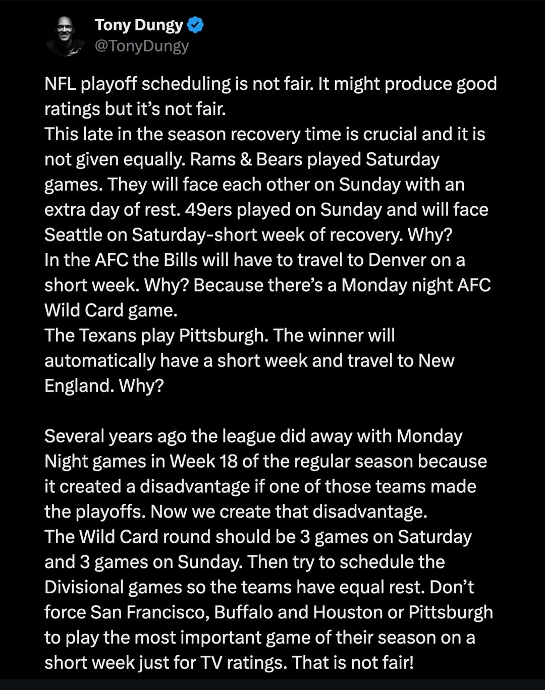 >>152994322He's right. The schedule has gone to shit in recent years. The owners and networks are too greedy and are diluting the product for views.32 teams playing 16 games with the top 2 seeds getting byes and no Monday nights or short weeks in the playoffs was peak efficiency and fairness.