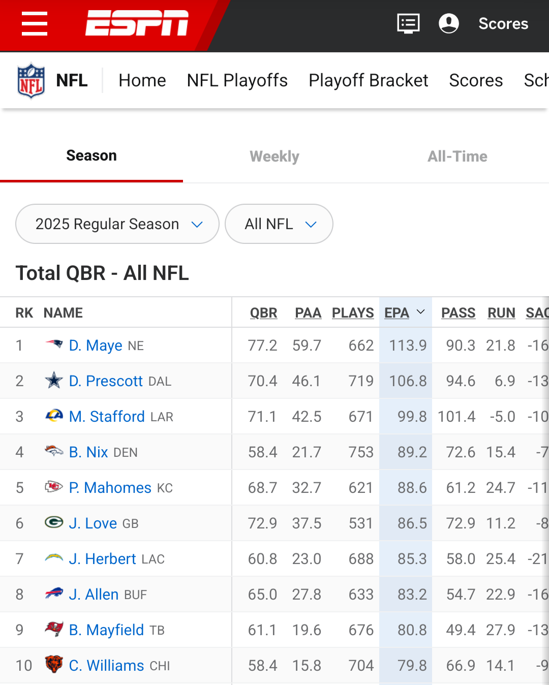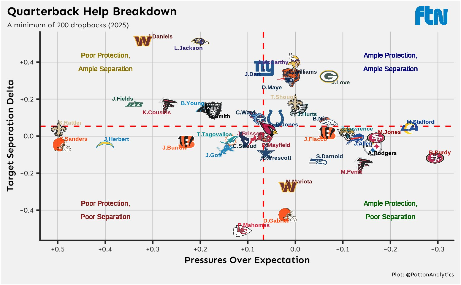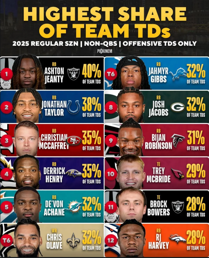 reminder: if a single non-QB player accounts for 25% or more for a team's TDs, that's a problem as they will be target #1 for the opposing defense and will get shut down in the playoffs