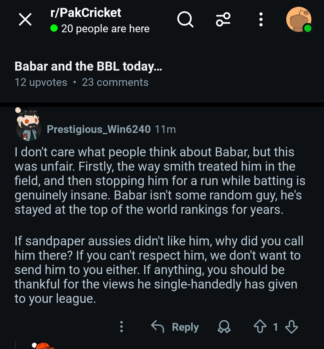>bbl aka 'nothing ever happens: the peegue' so irrelevant that aus flags are outing themselves as redditors and posting literal reddit screenshots to try and manufacture some '''''drama''''' from their t20 brainlet partybreaking news lads: nobody cares