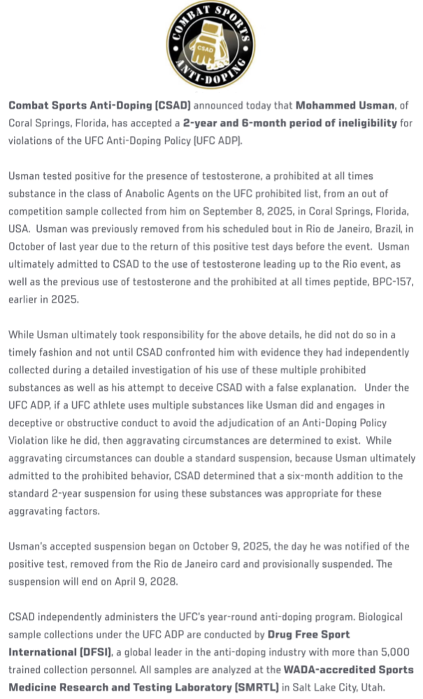 >>152998439>Popped out of comp Sep. 2025>Board investigates>Pulled from Oct. 2025 fight>Board investigates>During investigation Usman comes clean (not in a timely manner)>Given board had to investigate, they see the behavior as obstructive/deceptive>additional time added for "obstruction/deception">Suspension started Oct. 2025, and he can fight Apr. 2028
