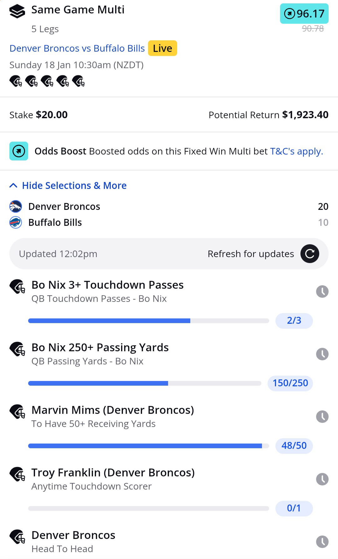 >>153016726just need denver to cover the spread and i'm up 600 also got a hundred on nix having more passing yards than butterfingers