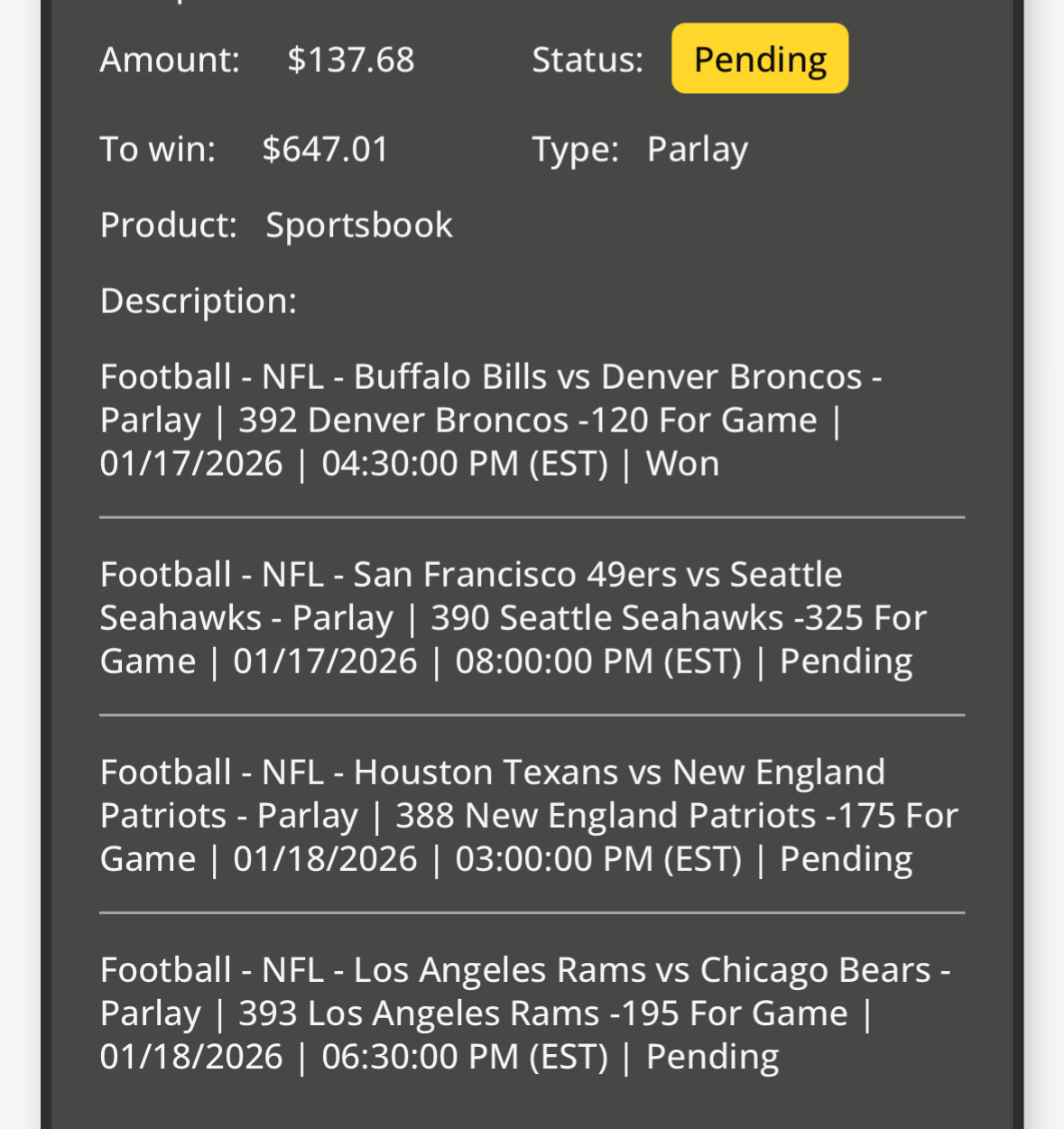 >>153027616ask yourself if you'd bet whatever the cash out is, on the patriots and rams winning for $647. If the answer is yes then hold