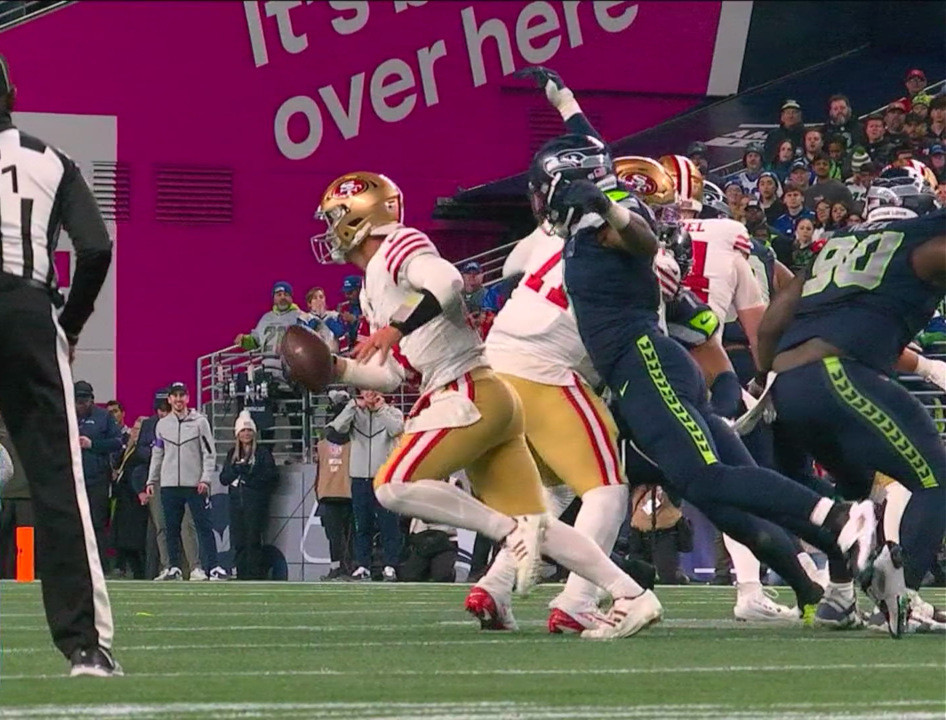 >4th down>Purdy runs for his life Every time, 9ers aren't going to win anything with shanahan/purdy