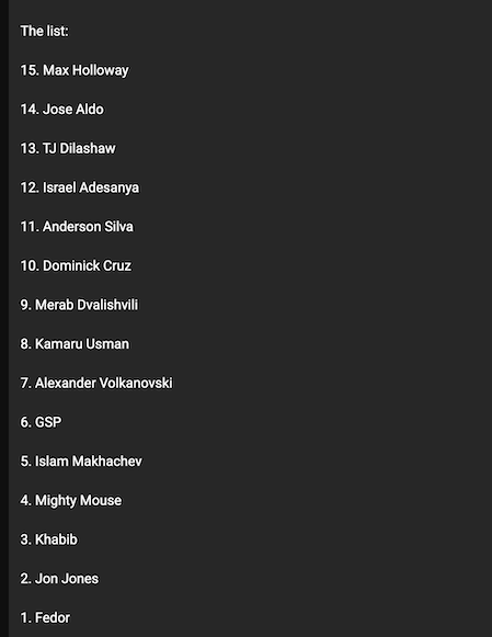 My top 15 15. Jose aldo 14. Tj dillashaw13. Connor mgregor 12. Dominick cruz 11. Adesanya 10. Kumaru 9. Anderson silva 8. Perreira 7. Petr yan6. Mighty mouse 5. Gsp4. Merab 3. Islam 2. Jon Jones 1. Tuporia