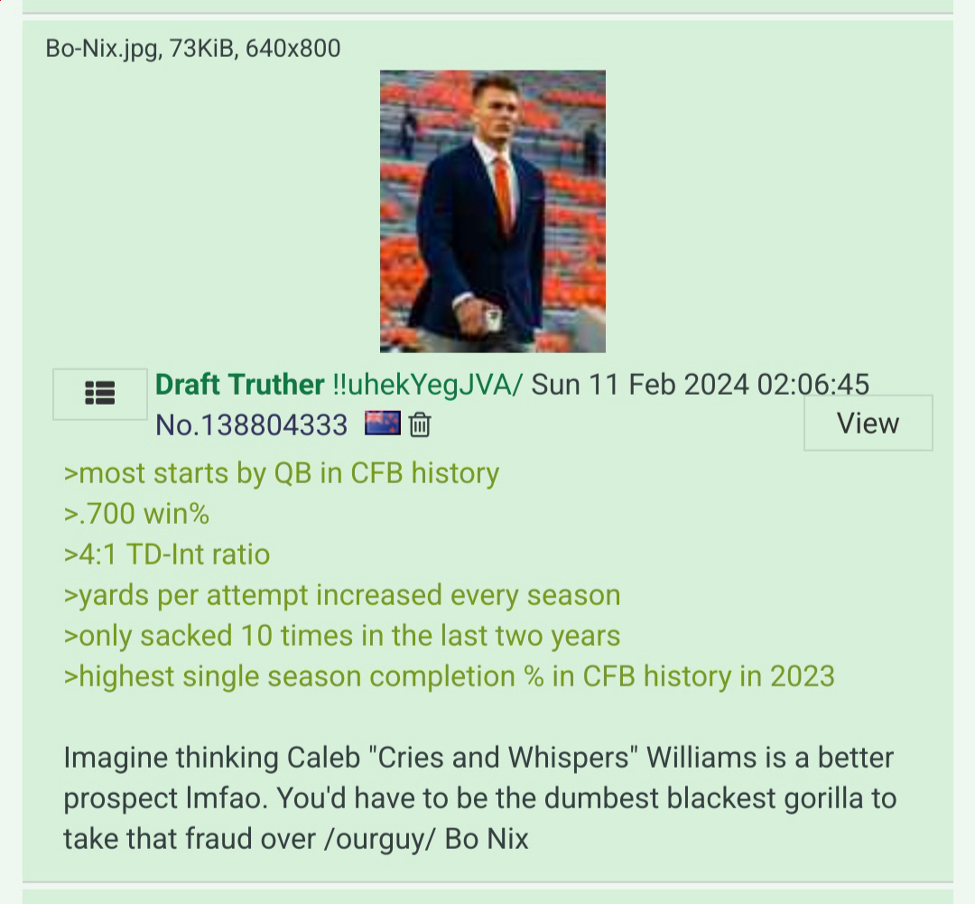 Drake Maye kind of sucks though. Pats have a legit good team and this retard just holds the ball for 6 seconds and fumbles over and over again no way they keep getting away with it.