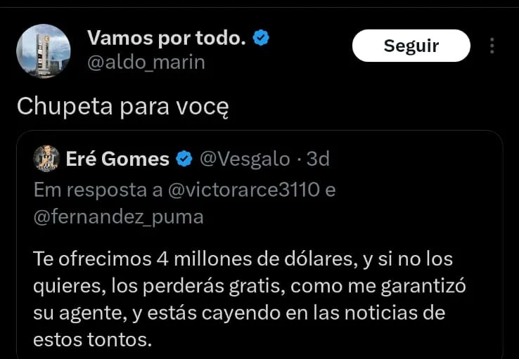 Diretor da La U responde torcedor do Atlético no X - (Twitter) sobre Assadi: ‘Chupeta para você’Aldo Marin, diretor da Universidad de Chile-LAU, provocou um torcedor do Galo que comentou as negociações entre os clubes envolvendo o meia Lucas Assadi.O atleticano se envolveu em uma discussão com torcedores da LaU e abordou valores especulados pela imprensa – além de garantir que conversou com o empresário do jogador. “Nós te oferecemos 4 milhões de dólares, e se você não os quiser, vai perdê-los de graça, como me garantiu o seu agente, e você está virando notícia desses idiotas”, escreveu o torcedor. Em resposta, Aldo Marin disse: “chupeta para você”.