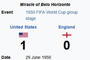 >>153086872>The American team consisted of semi-professional players, most of whom had other jobs to support their families>One player, Ben McLaughlin, had to withdraw from the tournament because he could not get time off work>At the time, the English had a reputation as the "Kings of Football">The English Daily Express newspaper wrote: "It would be fair to give the U.S. three goals of a start."